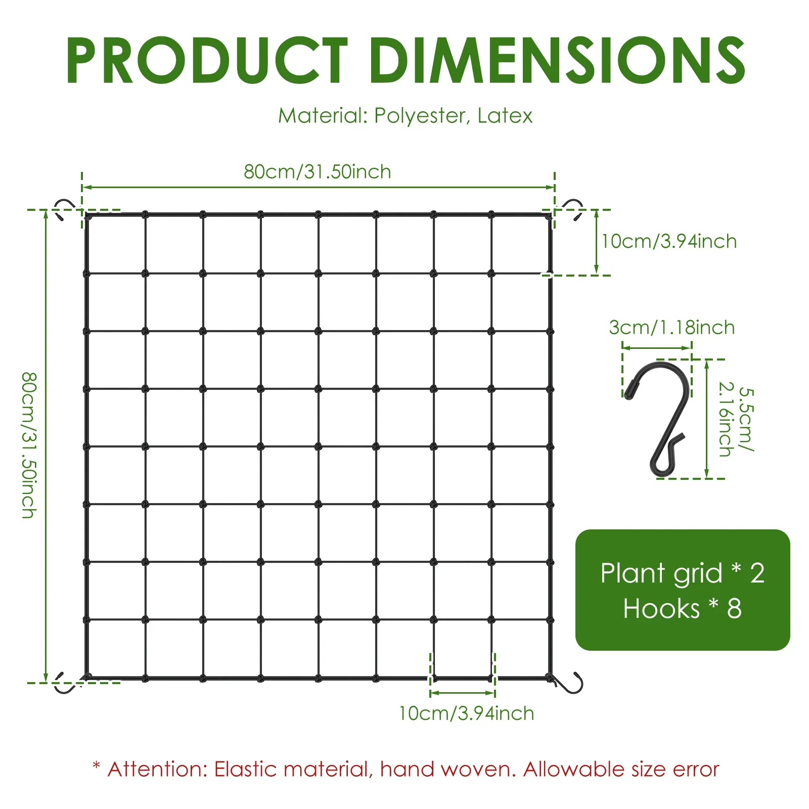 The hook measures approximately 3x5.5cm/1.18x2.17inch, with a single grid measuring approximately 10x10cm/3.94x3.94inch
