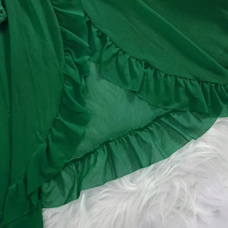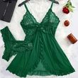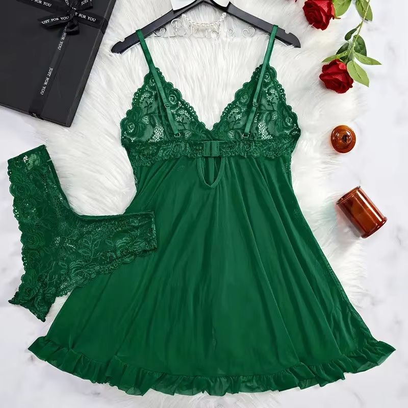 2 Pcs Set Lace Nightgown Women Exquisite Homewear New Green Nighttime Pajamas Transparent Split Nightdress V-Neck Bra Panty Sets