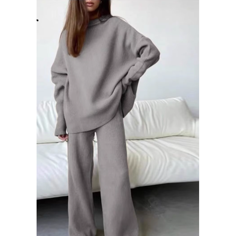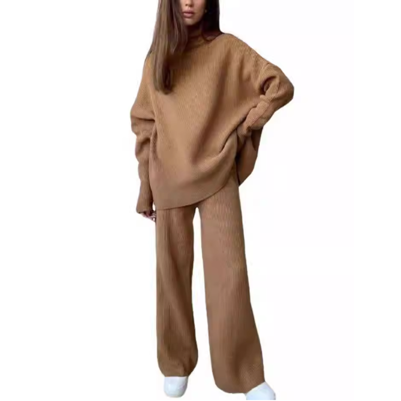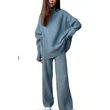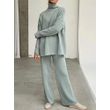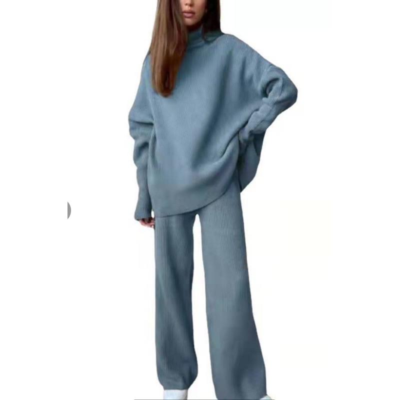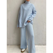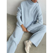 2 Pieces Women Sets Knitted Tracksuit Turtleneck Sweater Blue One size