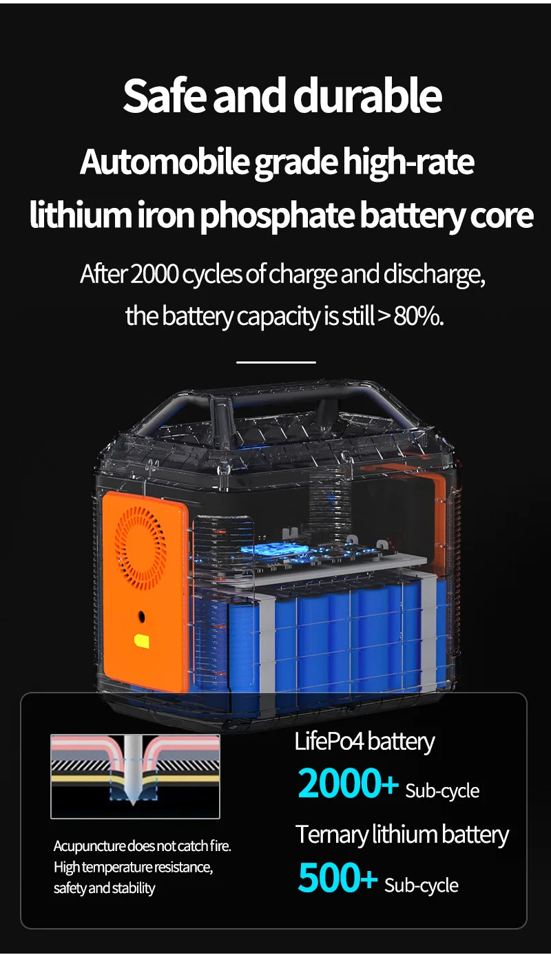 Multi-protection intelligent system management, BMS intelligent battery management system, real-time monitoring of the battery status automatically open the multi-protection system (over-voltage protection, overload protection, over-temperature protection, short-circuit protection, over-discharge protection, intelligent heat dissipation), the use of safety.