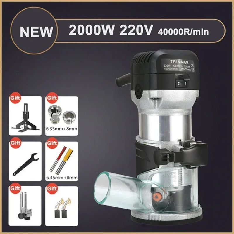 Shipping accessories list: Electric trimmer * 1+straight guide rail * 1+carbon brush * 2+one set of installation kit * 1+6.35mm chuck * 1+6.35mm milling cutter * 1+8.00mm chuck * 1+8.00mm milling cutter * 1+manual (in English) * 1