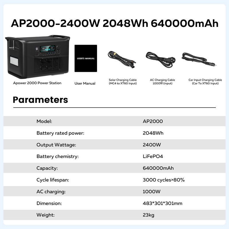 2000Wh Portable Power Station Lifepo4 Batteries Outdoor Powerful Power Bank 640000mAh Large Capacity Secondary Battery Camping