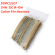 200PCS 1/4W Carbon Film Resistors 5% 1R-10M 10R 47R 56R 100R 220R 1K 4K7 6K8 100K 330K 560K 1M ohm Color Ring Resistance
