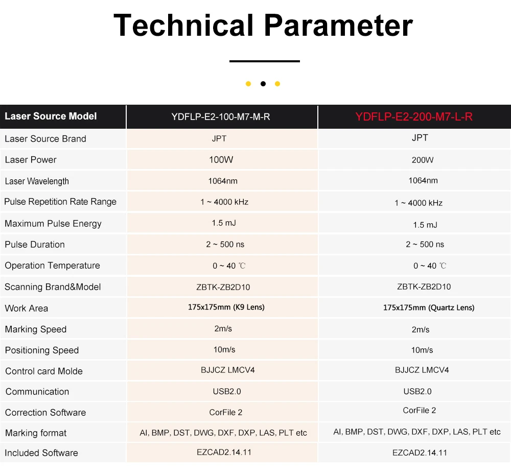 A: There are several advantages of JPT LP technology over Q-switched pulsed fiber lasers with frequencies ranging from 20 to 80 kHz. The JPT MOPA M7 model frequency ranges from 1 to 4000 kHz, and the RAYCUS RFL-P50QB model frequency ranges from 50 to 100 kHz, which allows you to work on various materials, not just metals. The laser beam quality is also a factor; JPT is a better choice for jobs requiring precision or artwork with intricate details.