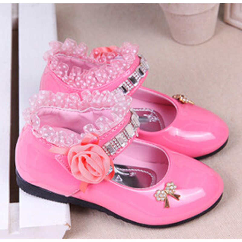 2021 New Flower Girls Shoes Spring Autumn Princess Lace PU Leather Shoes Cute Bowknot Rhinestone For 3-11 Ages Toddler Shoes