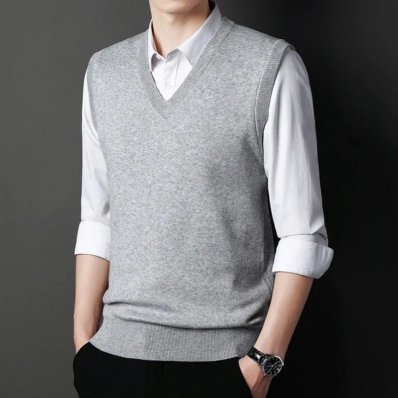 2024 Autumn Winter New Men's Solid Color V-neck Knitted Vest Casual Fashion Warm Sweater Versatile Top