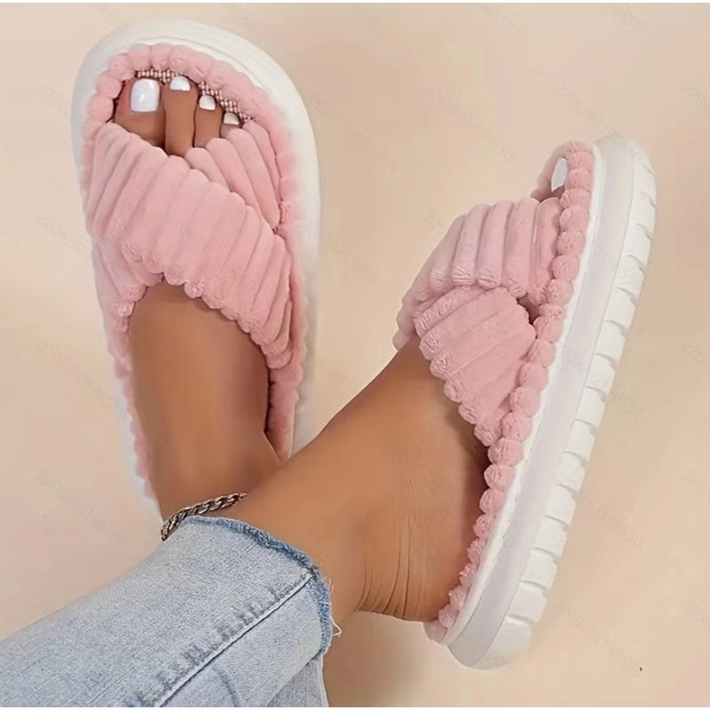 2024 Autumn Winter New Women Home Slippers Open-Toe Cross Band Linen Soled Indoor Slides Linen Soled Non-Slip Bathroom Slippers