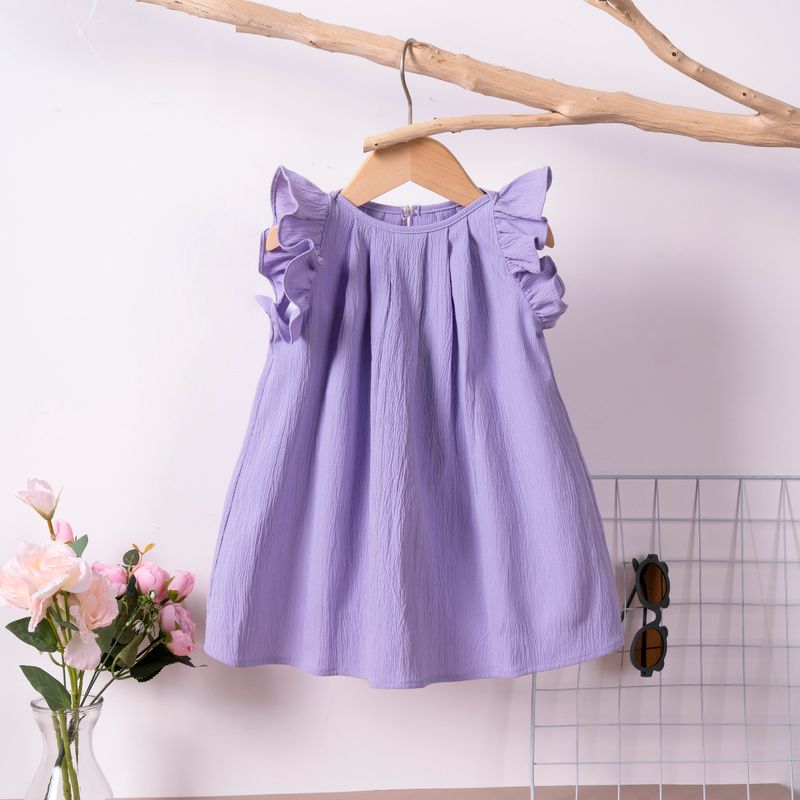 2024 Hot selling Solid Color Button Girl Baby Little Flying Sleeve Dress Princess Style Polyester Cute Baby Dress