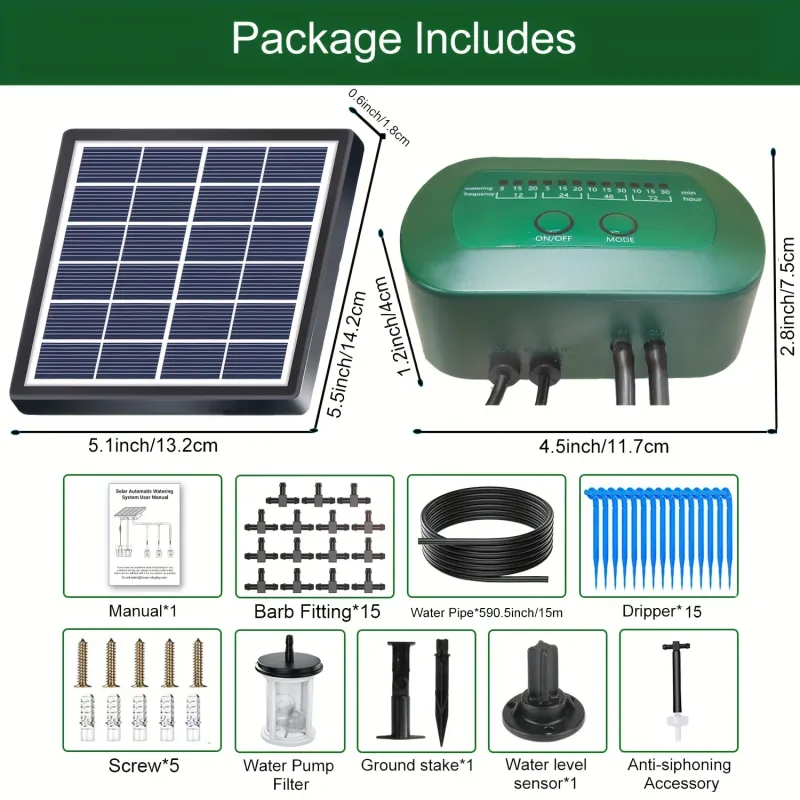 5. Complete accessories: Automatic watering system, including solar panels * 1 timer * 1 15 meter long hose * 15 T-heads * 15 anti siphon hoses * 1 filter.