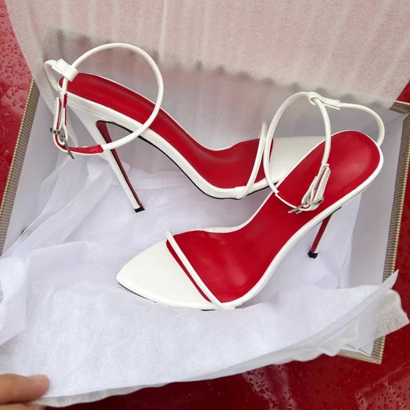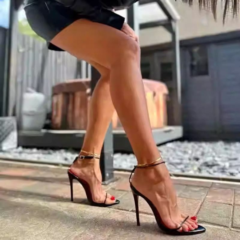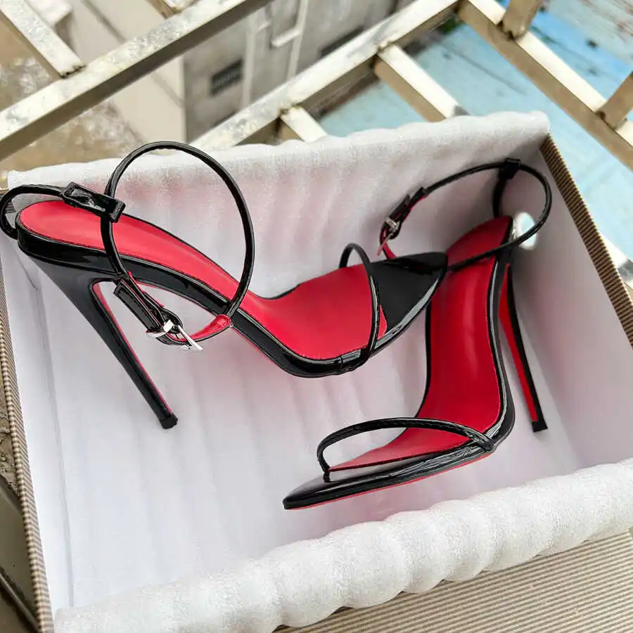 2024 Summer New Sexy Thin Heels with Red Bottom High Heels for Women, Black Lacquered Leather One Button Sandals with Open Toes