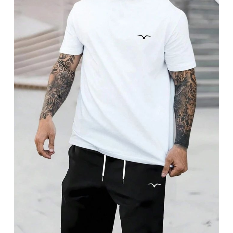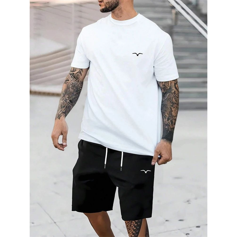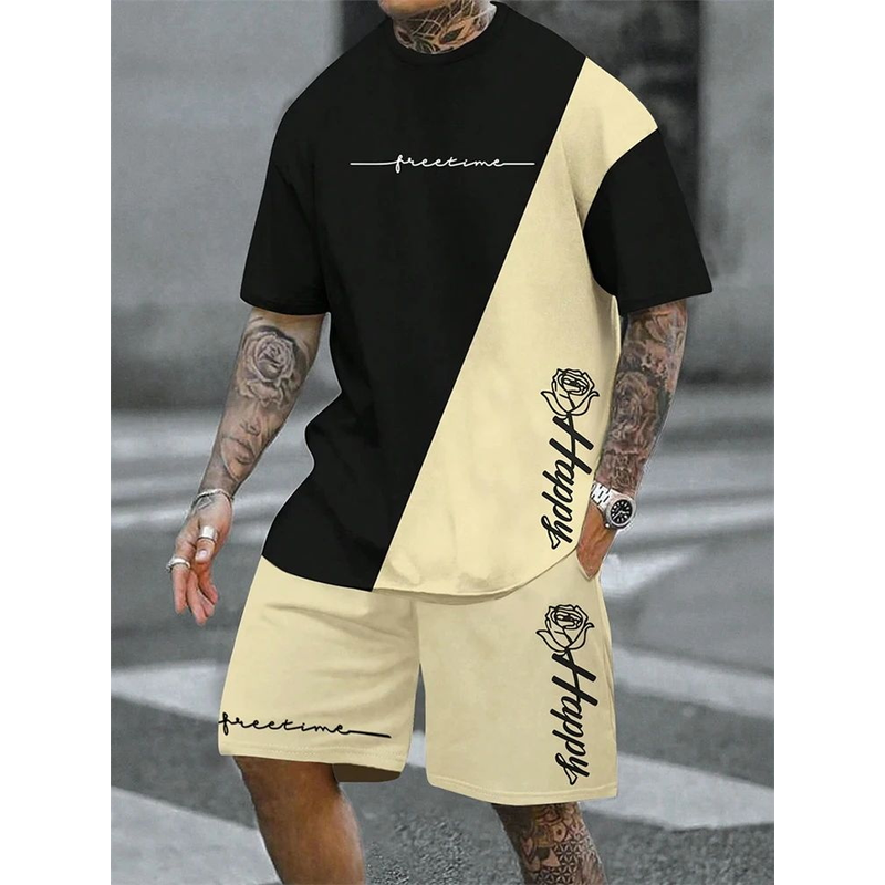 2025 hot selling spliced pattern men's T-shirt round neck short sleeved drawstring shorts outdoor breathable quick drying short