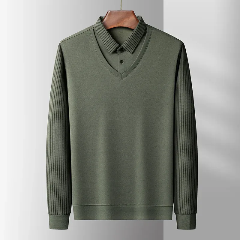 2025 New Men's Casual and Fashionable Long Sleeved Solid Color Fake Two-piece Polo Shirt Business All Season Versatile Top