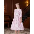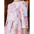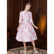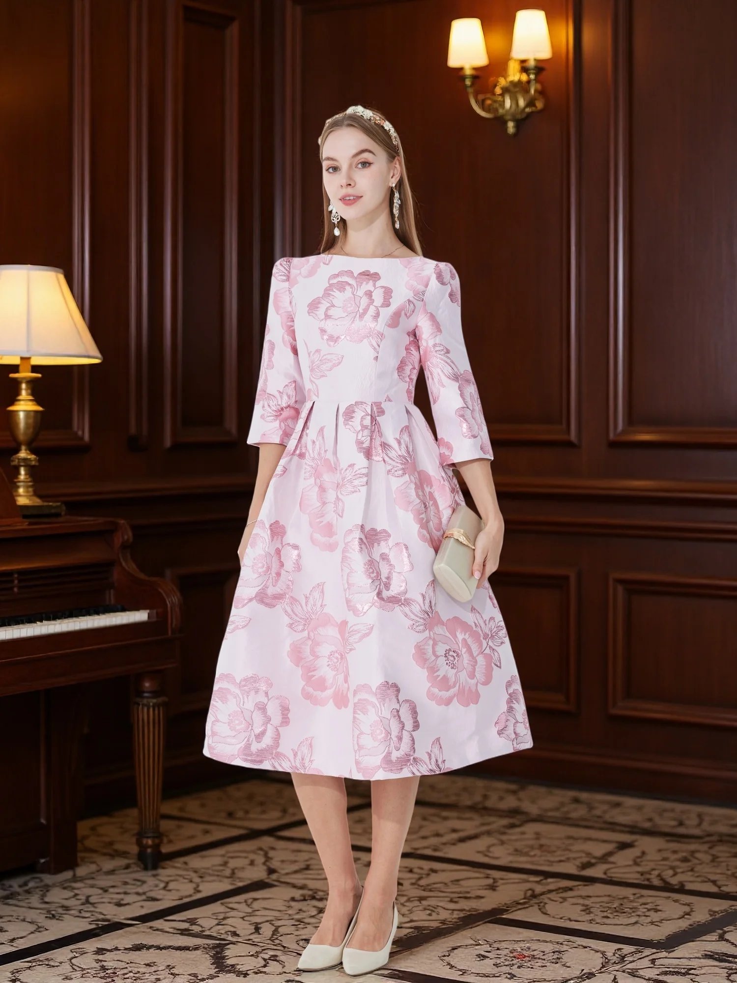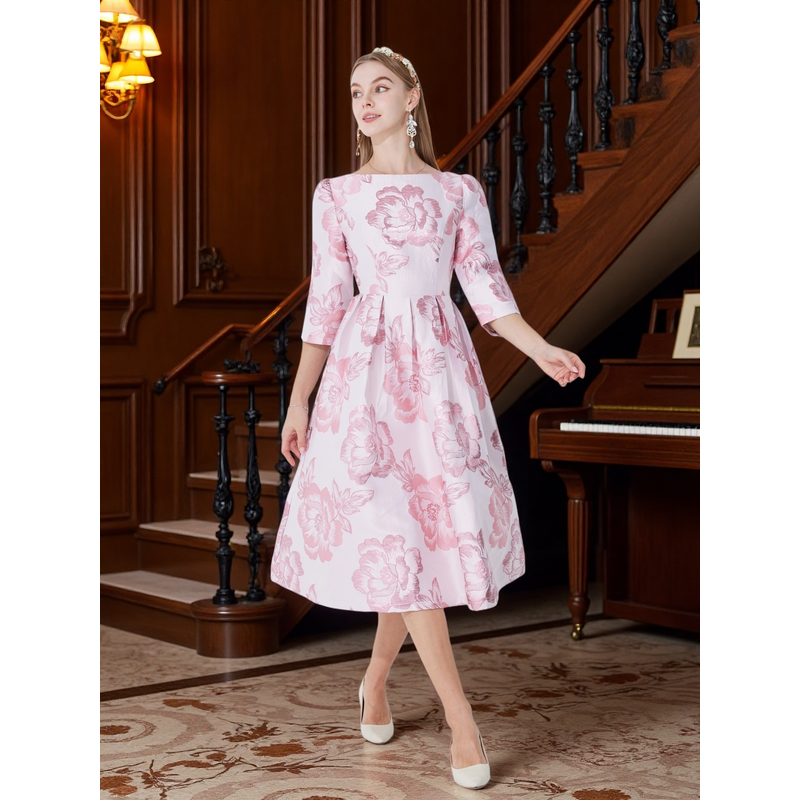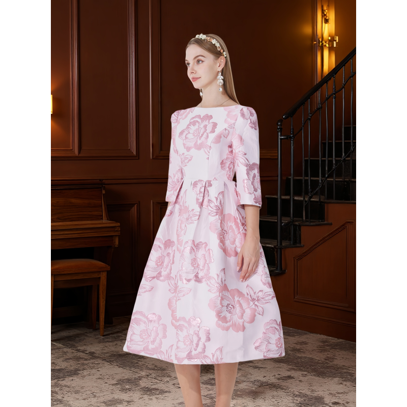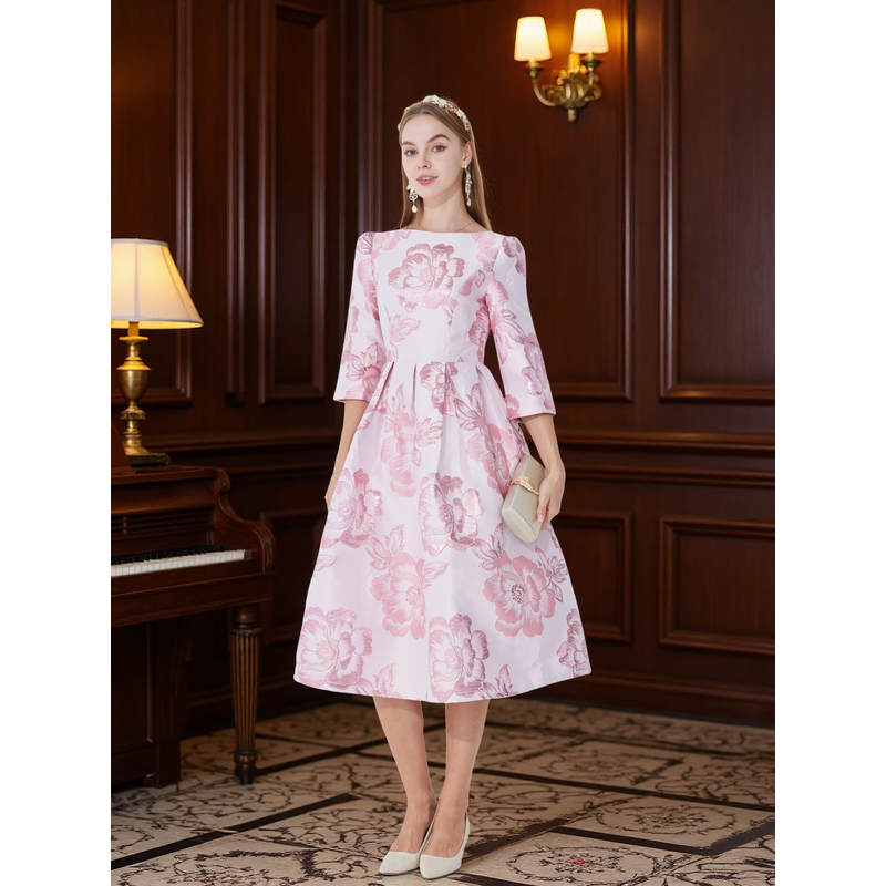 2025 New Plus Size Evening Dress - Jacquard Satin Waist-Defining Tummy-Control Three-Quarter Sleeve Elegant Flared Dress