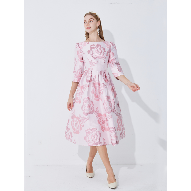 2025 New Plus Size Evening Dress - Jacquard Satin Waist-Defining Tummy-Control Three-Quarter Sleeve Elegant Flared Dress