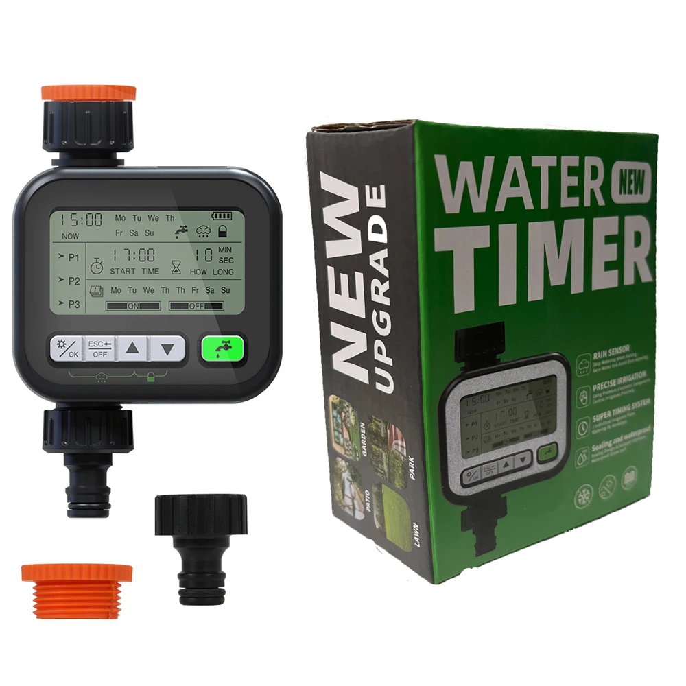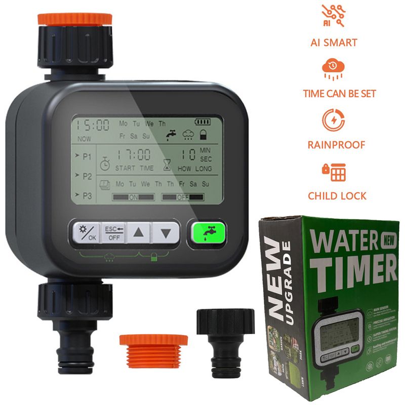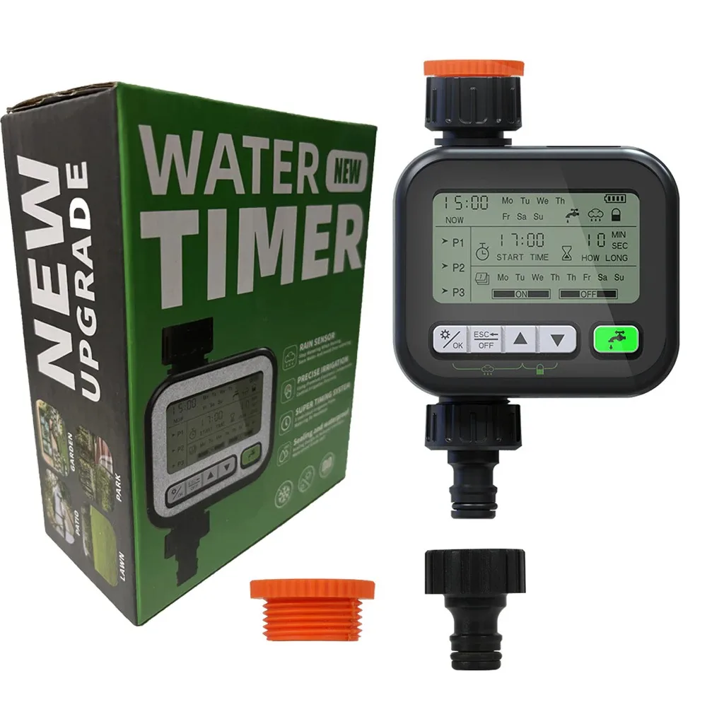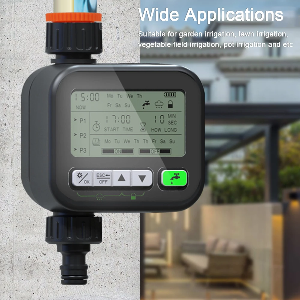 This watering timer adopts rain sensing control technology, support normal irrigation on sunny days, and automatic shutdown on rainy days, and when the water on upper of the sensing chip evaporates naturally or wipes dry, it will automatically resume the timing setting program. 3 sets of independent timing programs can be set. One program can only choose one mode. Support set the starts time, watering time and endurance time, interval time,etc. Suitable for garden irrigation, lawn irrigation, vegetable field irrigation, pot irrigation and etc.