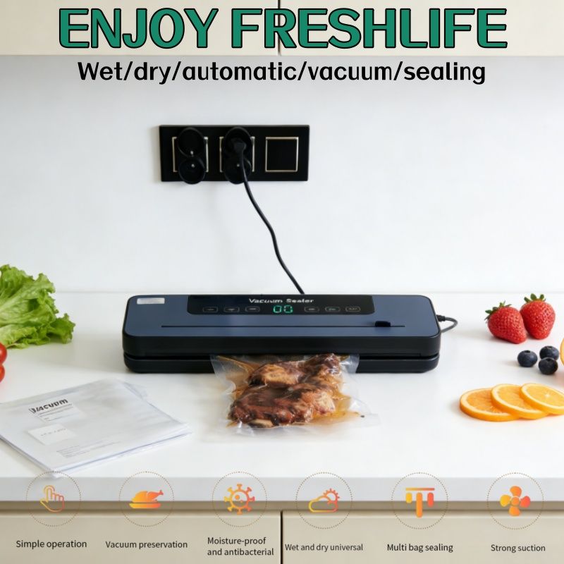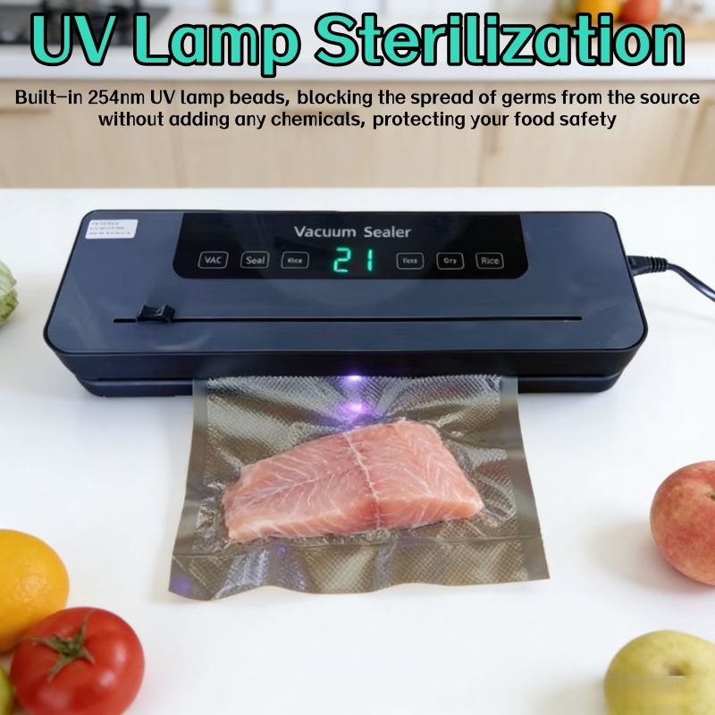 1.Experience the power of our food vacuum sealer, equipped with a purple light sterilization system for top-notch food safety. Its extended wide sealing design ensures a tight seal, keeping your food fresh and reducing waste.