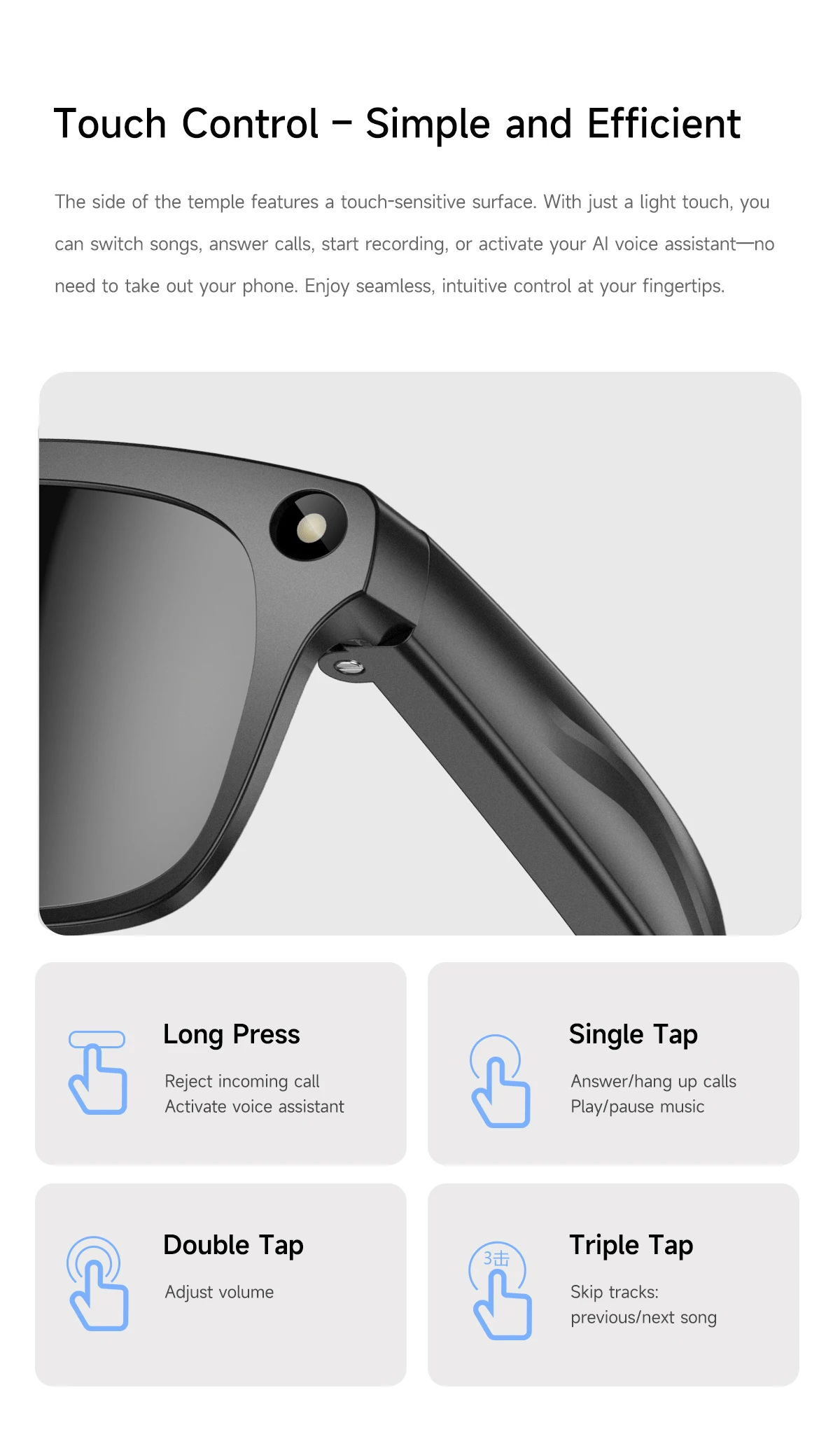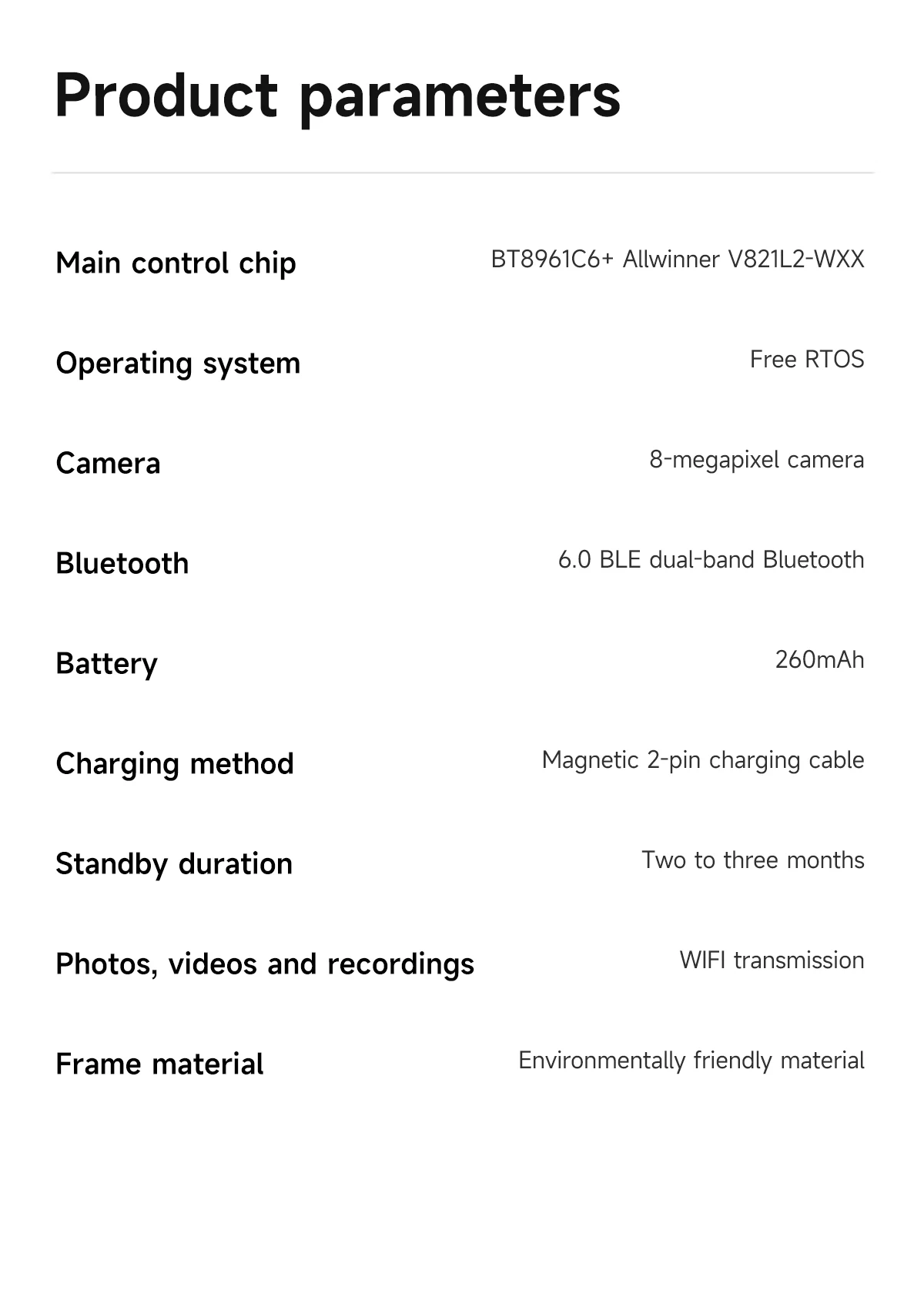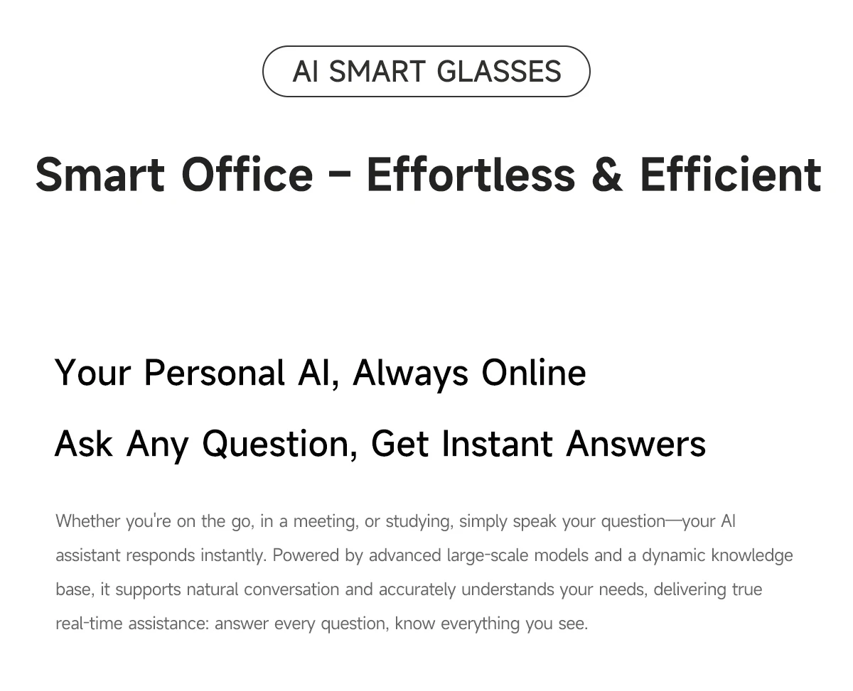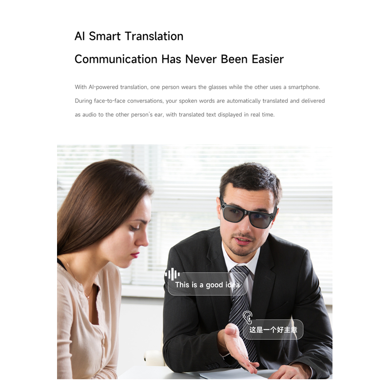 Main Features: AI voice assistant/photo taking/video recording/audio recording/music control/calling/alert sounds/indicator lights/translation/object recognition/touchscreen/music playback (music control, local music) etc.