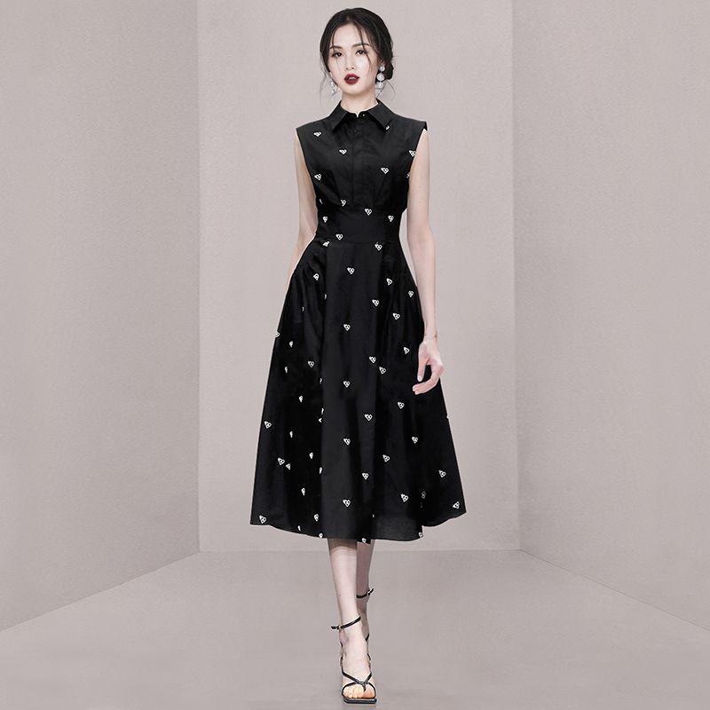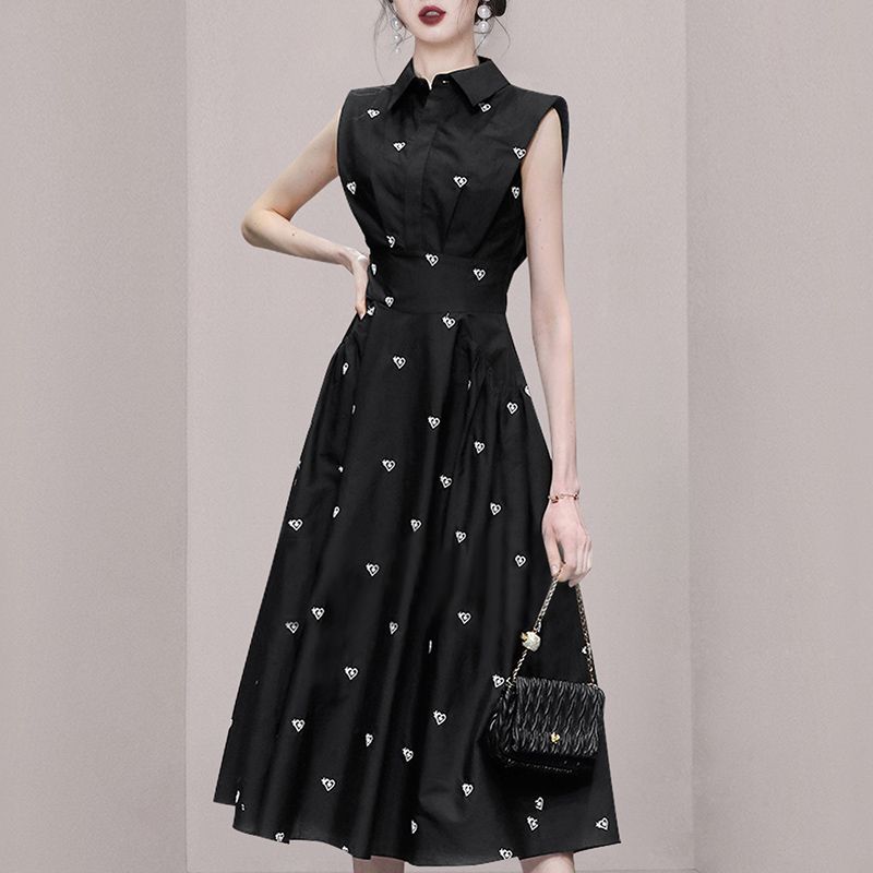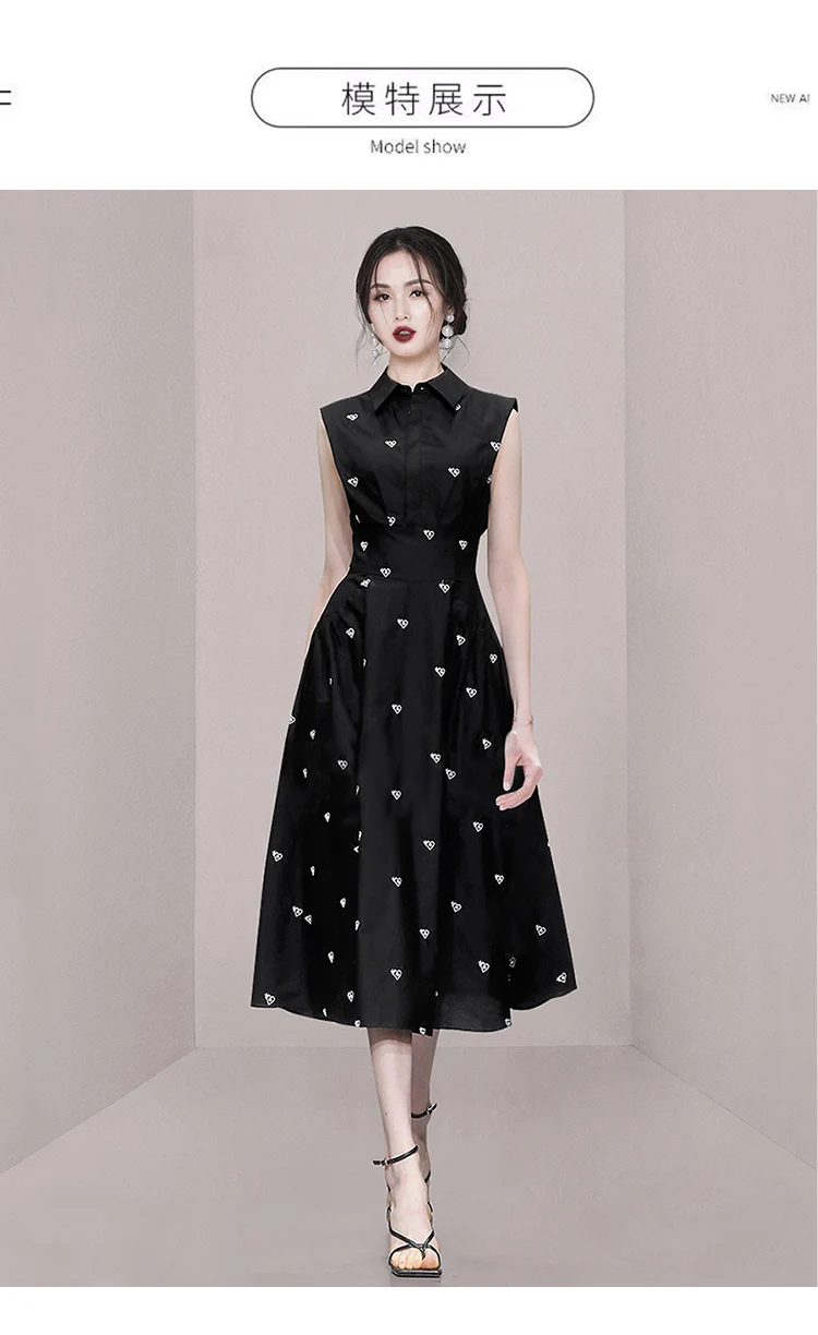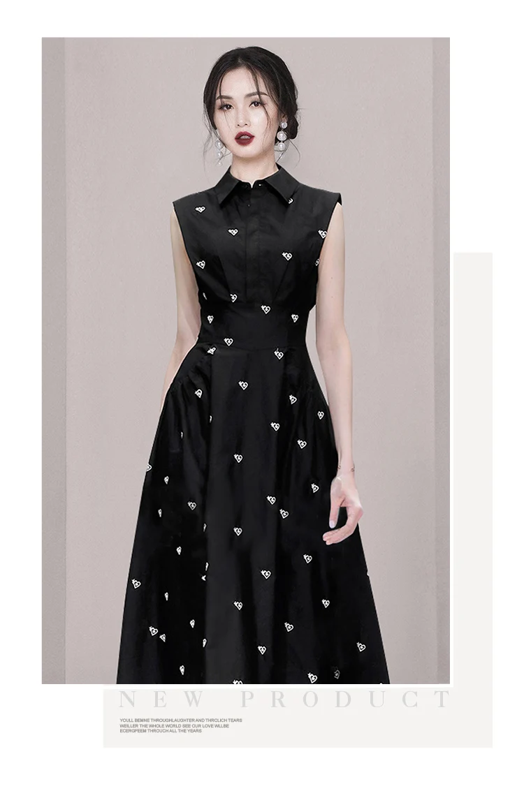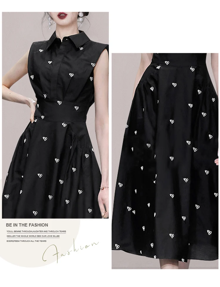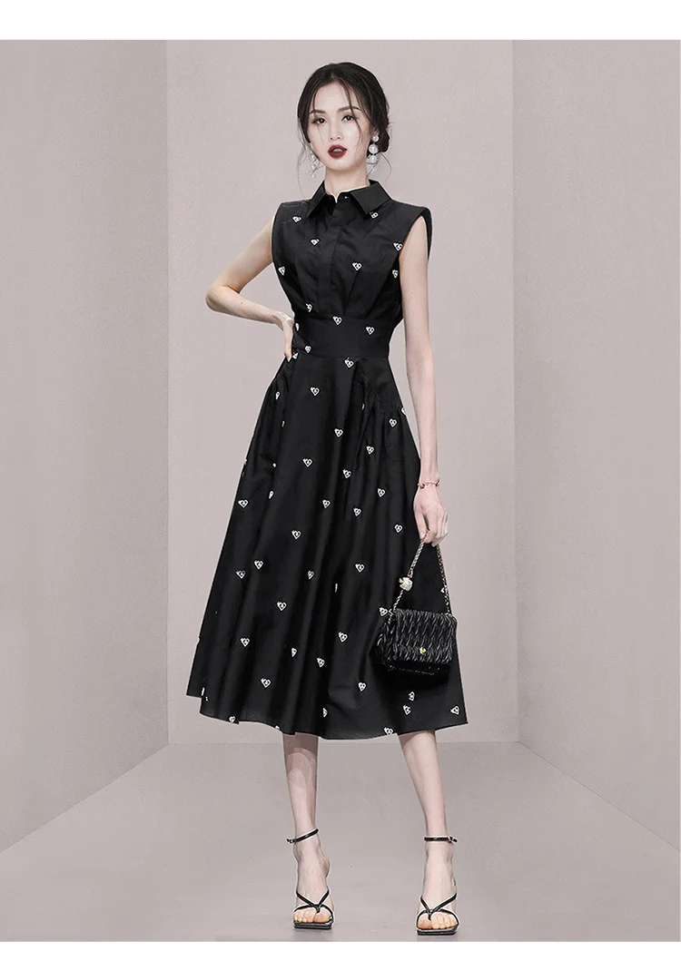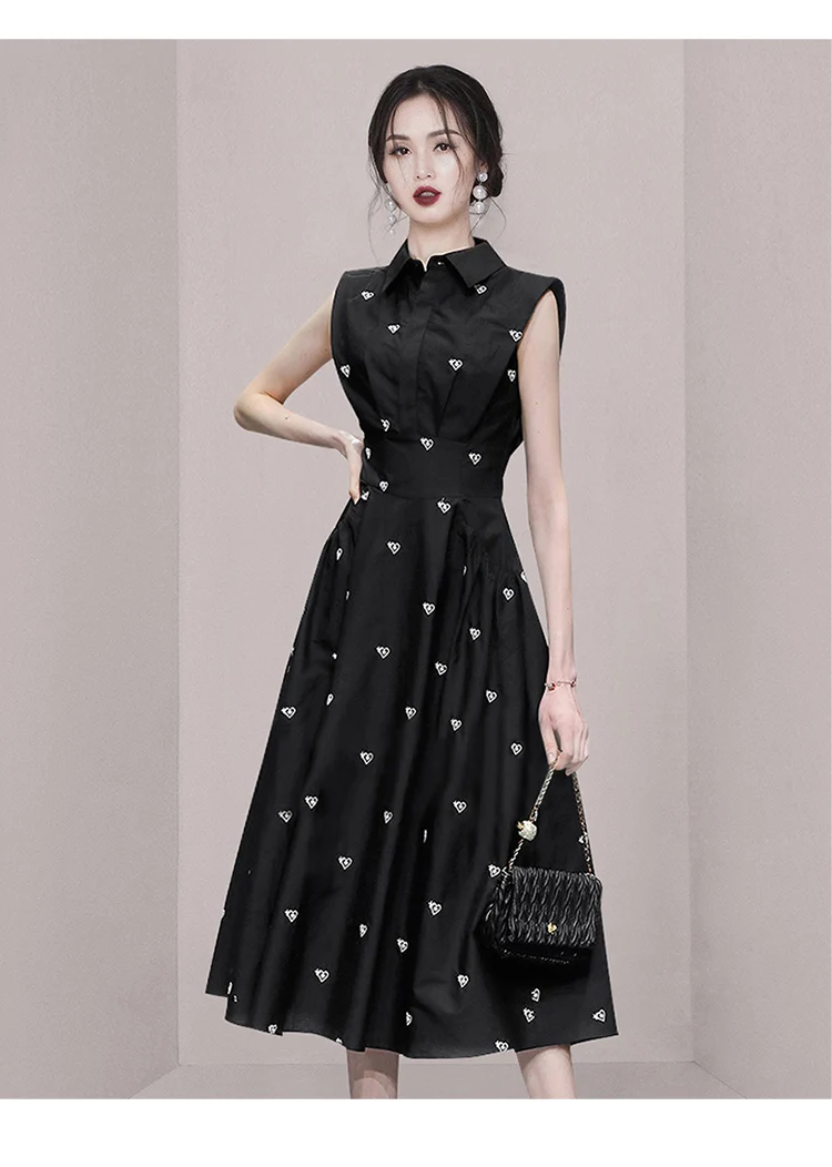 2026 Fashion Summer Shirt Collar Dress French Women Single Breasted Sleeveless Embroidery Heart Slim Office Party Midi Dresses