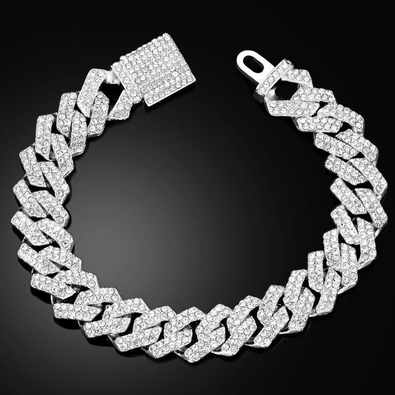 1. **Luxurious Full Rhinestone Design** – Every link of this **Cuban chain bracelet** is encrusted with high-quality **rhinestones**, creating a dazzling **iced-out effect** that catches the light from every angle.