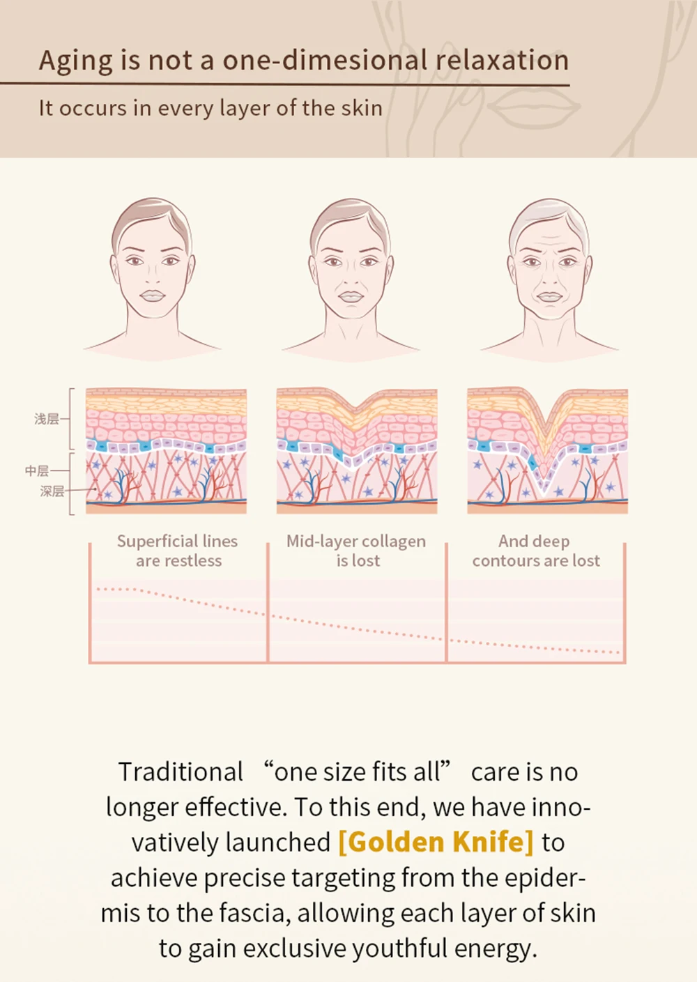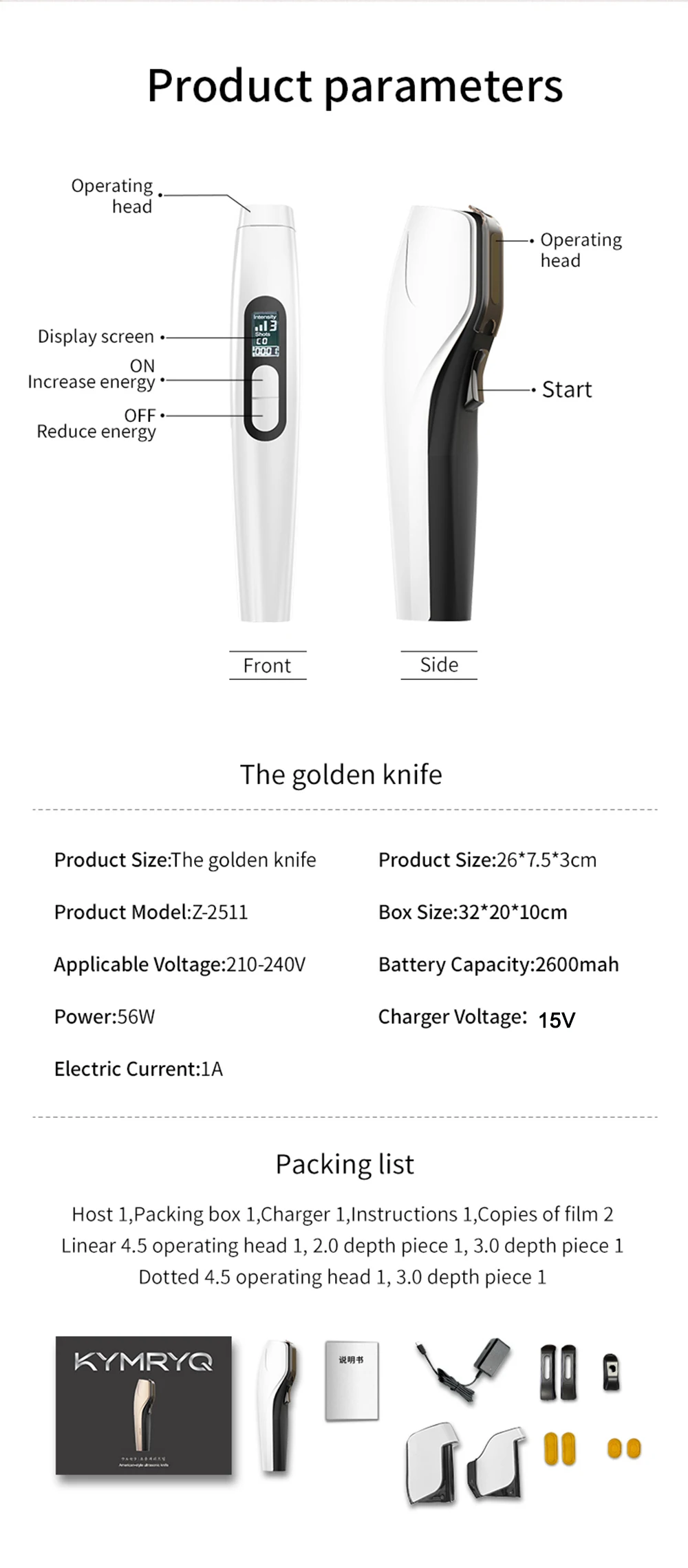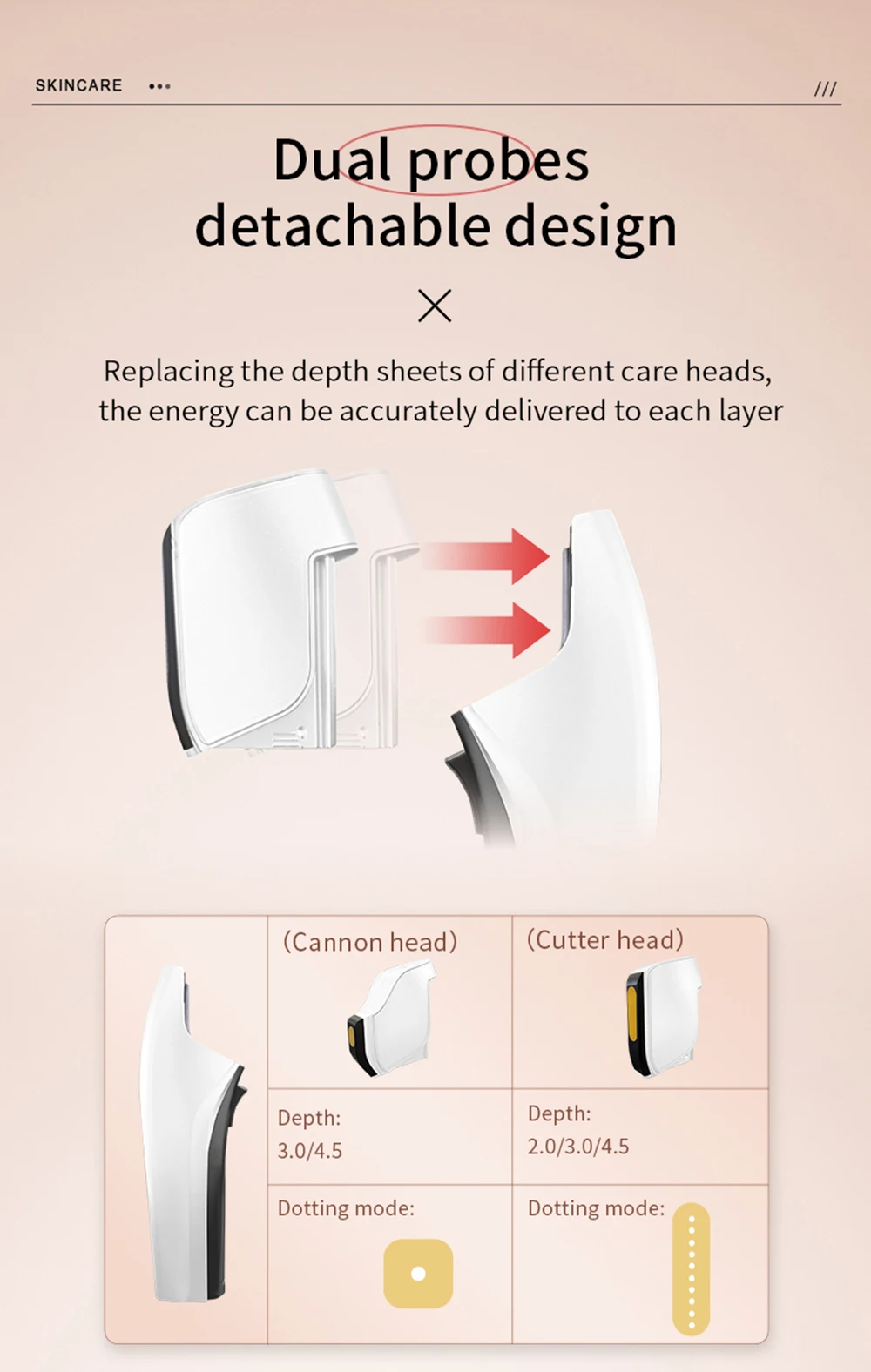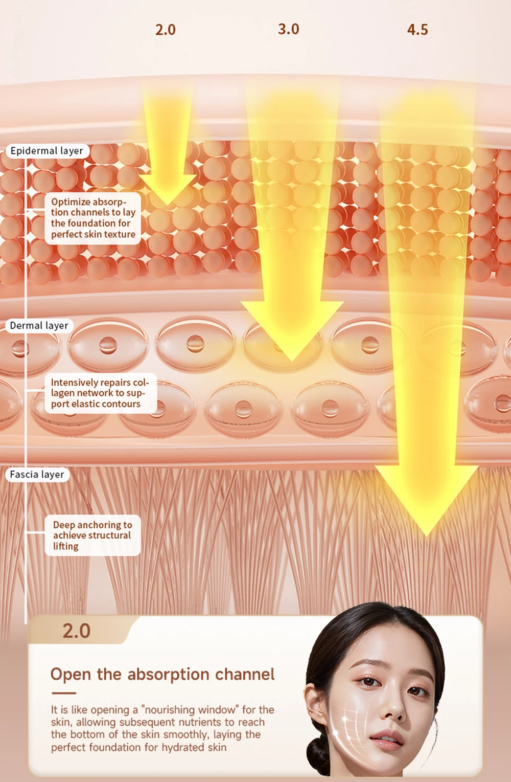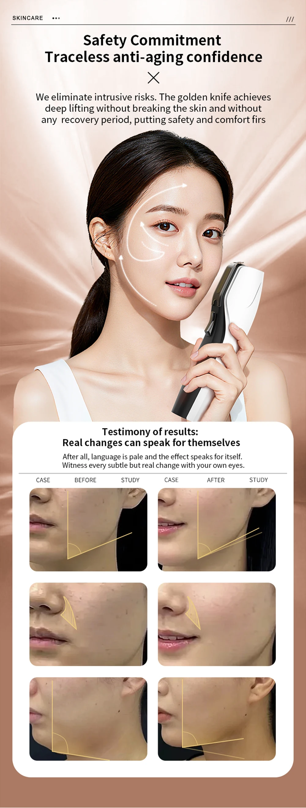 It is recommended to use a mixture of 3.0 and 4.5 operating heads for operation. When operating, it is recommended to start from the front low, and the probe should be pulled upwards from the jawbone to below the frontal bone. Then, the probe should be pulled upwards from near the corner of the mouth towards the front of the ear, and finally pulled upwards along the lower edge of the apple muscle from the nose to near the temple; (When operating, the movement speed should not be too fast, and can be operated back and forth 3-5 times, set according to personal relaxation)