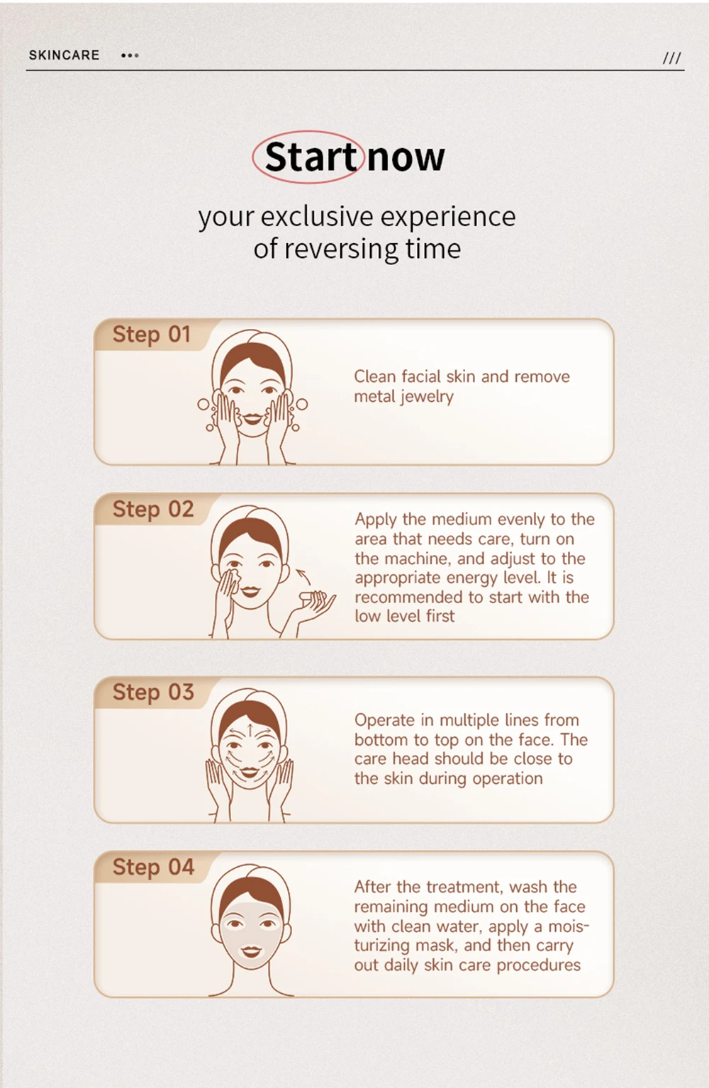 Apply the medium evenly to thearea that needs care, turn onthe machine, and adjust to theappropriate energy level. it isrecommended to start with thelow level first