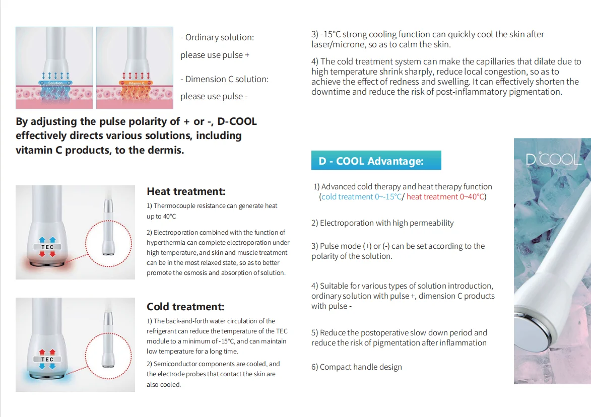 DCool is the top performer in post-care facial applications. It utilizes heat to open the pores, and electromagnetic forces to saturate the skin layer with nourishing solutions to accelerate healing and to rejuvenate the skin directly. After the electromagnetic application of nourishing solutions, customized to your face and skin and their situation, DCool uses coolness to help close the pores, locking in the absorption of nutrients, and to tighten the skin.