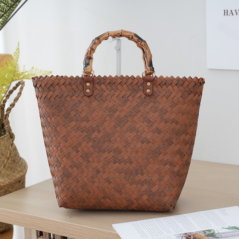2026 New Handwoven Bamboo Handle Tote Bag Women's Retro Handbag Casual Simple Sle No oulder Strap Open Top Soft Bag