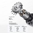 It is equipped with a high-speed motor reaching speeds of 110,000 rpm , which generate airflow by squeezing air out of a conical pressurised air duct. Airflow speeds can reach a maximum of 62m/s.