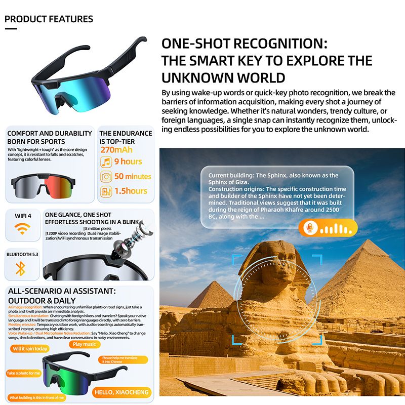 2026 New Sports Cycling Glasses with 800W HD Camera AI Voice Assistant Bluetooth 5.3 270mAh Battery Capacity Outdoor Activities