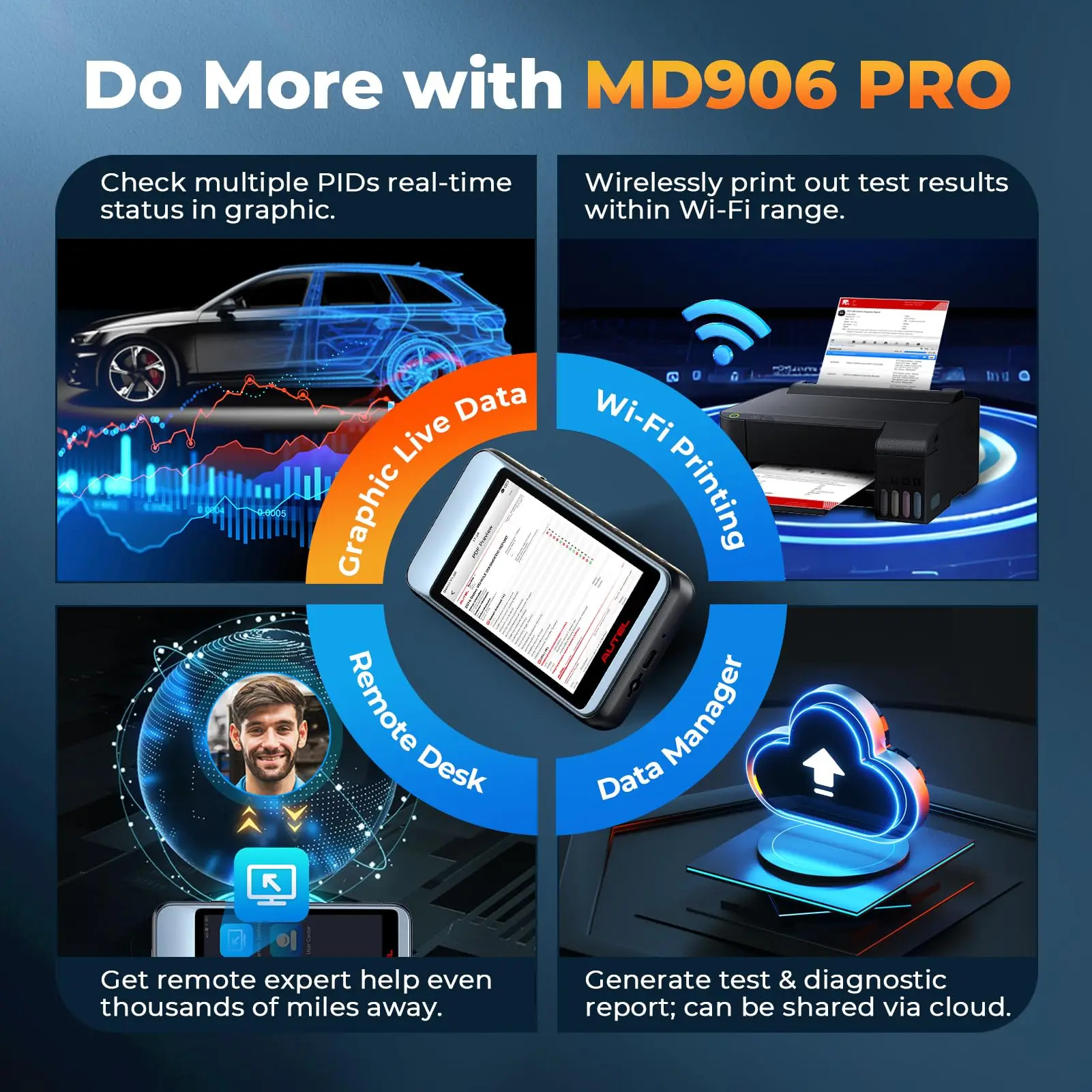 MD906 Pro supports Extensive and current year vehicle coverage for U.S., Asian, and European vehicle makes, access to all modules in all systems