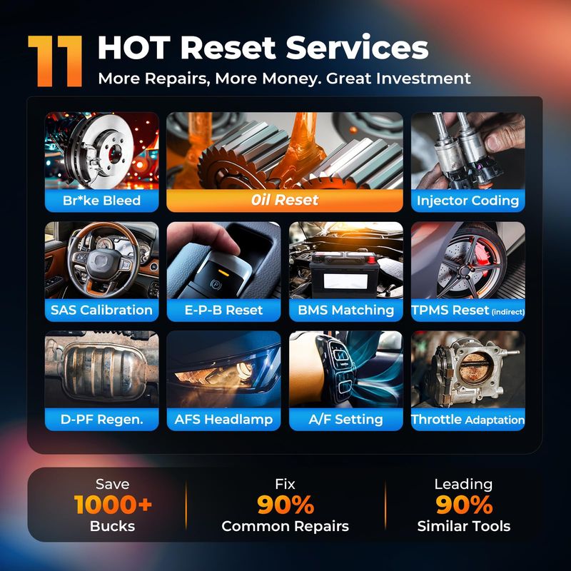 Autel MD906 Pro covers 11 key service functions: Oil Reset, Brake Bleeding, Injector Coding, SAS Calibration, Throttle Adaptation, EPB, BMS, TPMS, DPF Regeneration, AFS Headlamp, and Air-Fuel Ratio (A/F) Adjustment. These essential features ensure reliable maintenance support for modern vehicles across various makes and models.