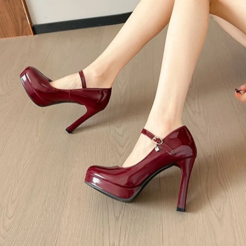 2026 Spring Fashion Women's High Heels Round-toed Buckle Black Leather Shoes Solid Color Platform Ladies Pumps Plus Size 34-42