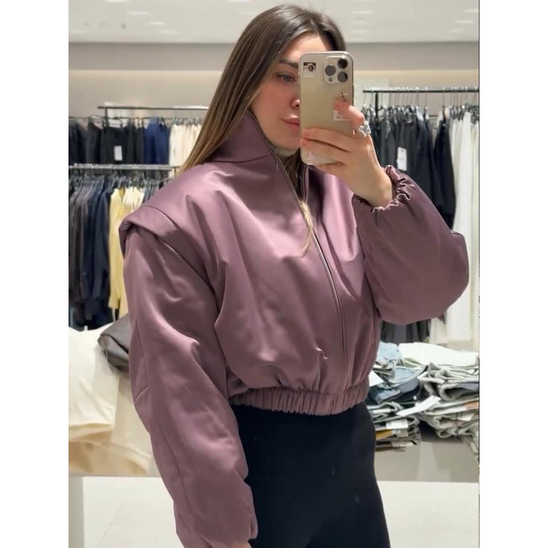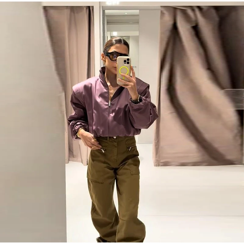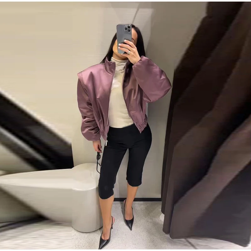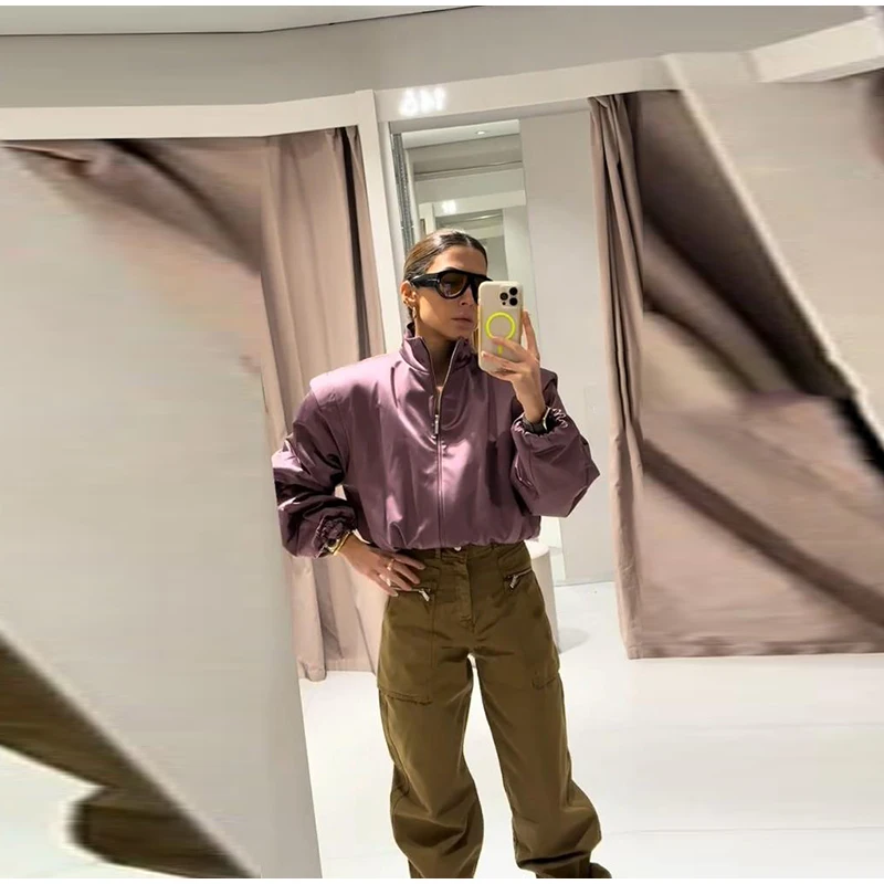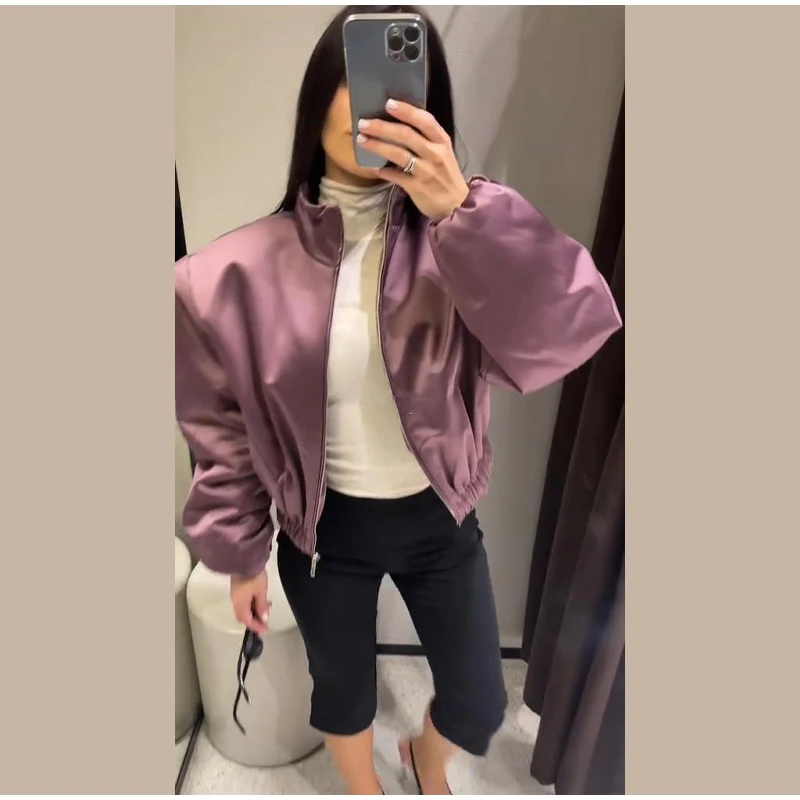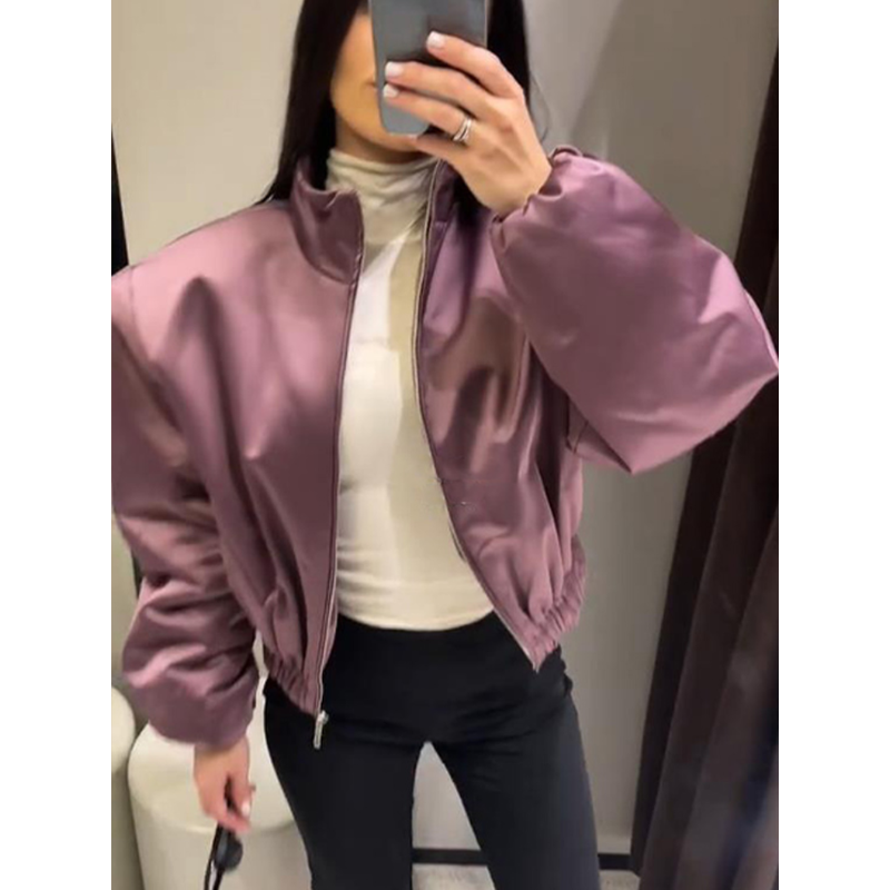 2026 Spring New Long Sleeve Bomber Jacket For Women Casual Zipper Stand Collar Cropped Coats Lady Solid Bike Street Chic Tops