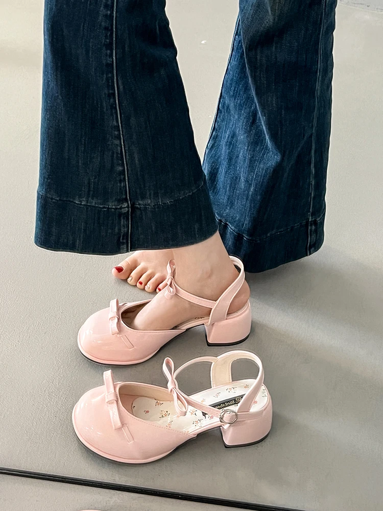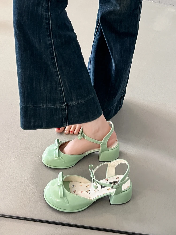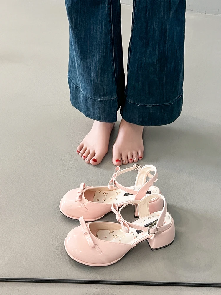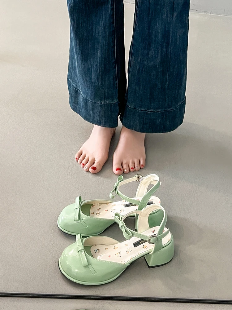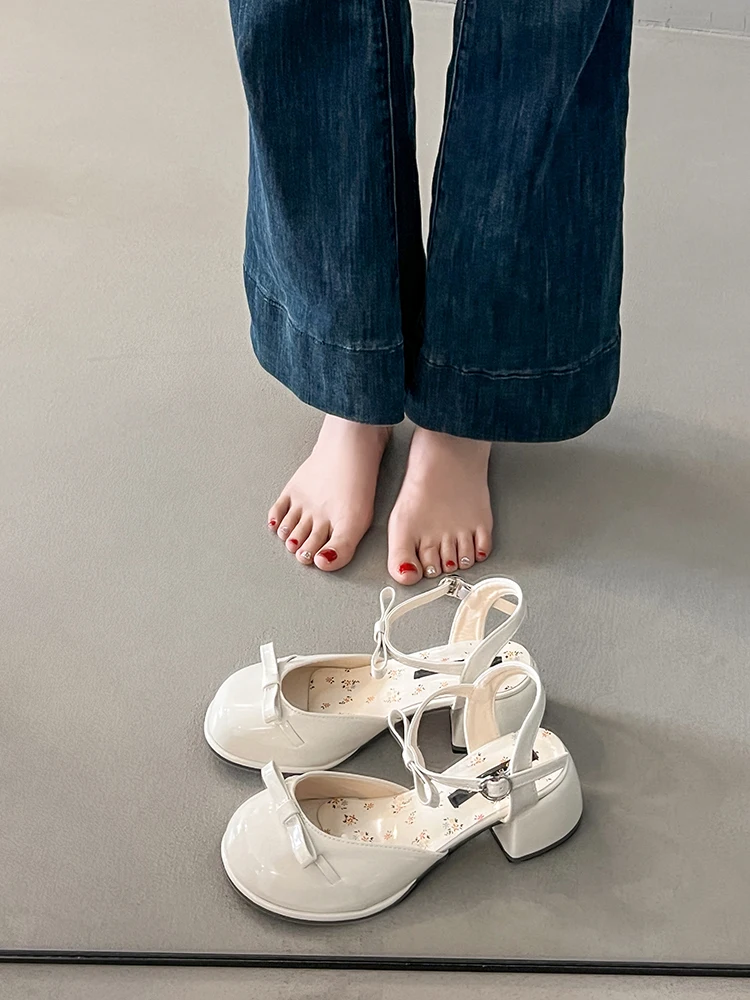 2026 Summer Closed Toe Sandals Sale Of Women's Shoes Block Heels Buckle Strap New Chunky Bow Girls Retro Scandals Bow Shoes Buc