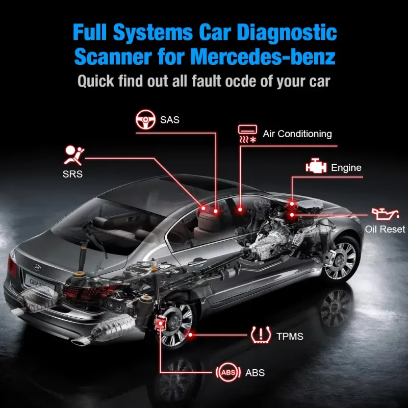 For Mercedes Professional Scan Tool can read and erase trouble codes for complete systems like Engine, HVAC (Air Conditioning), Transmission, ABS, SRS, TPMS, ,Battery, Headlight, Radio, Video, Phone, Security , etc.)