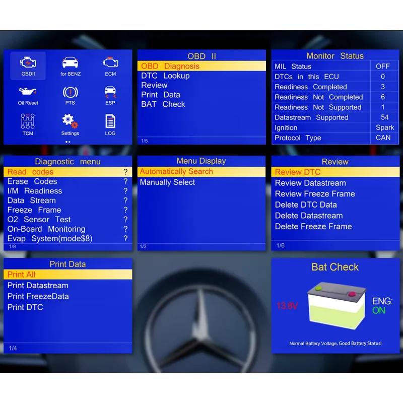 It is able to diagnose the electronic control system Replacement for Mercedes Benz series vehicles, Engine, HVAC (Air Conditioning), Transmission, ABS, SRS, TPMS, Battery, Headlight, Radio, Video, Phone, Security , etc.). It also supports full OBD2 functions to display live data stream, on-board monitor test (mode 6), EVAP test (mode 8), O2 sensor test, etc. Locate and address vehicle problems, turn off warning light after repair.