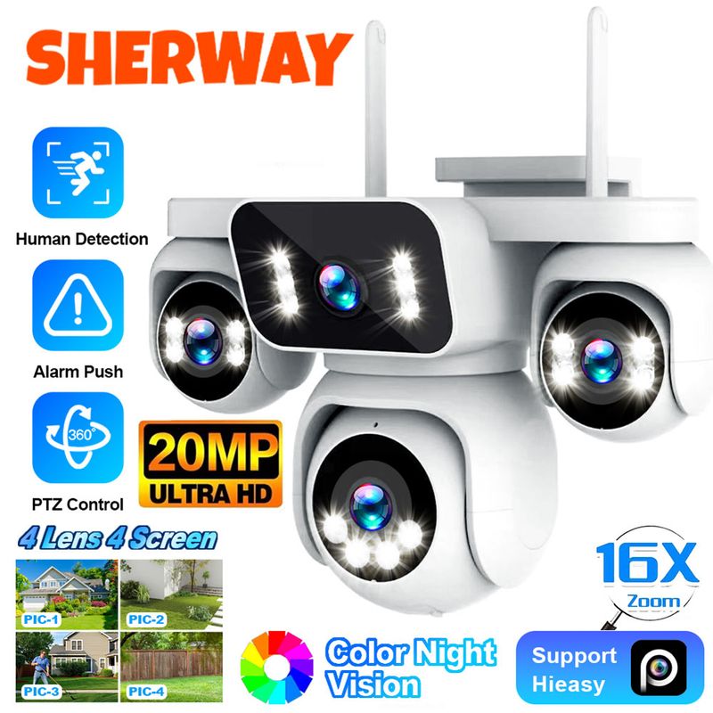 20MP 10K Four Screens WiFi Security Camera Outdoor Four Lens 360° PTZ 16X Zoom  Auto Tracking CCTV  Wireless Surveillance IP Cam Hieasy APP