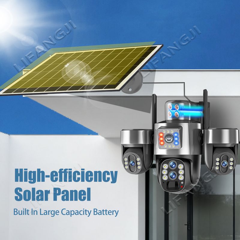 1. Three-screen three-PTZ 10X digital zoom, solar powered battery camera