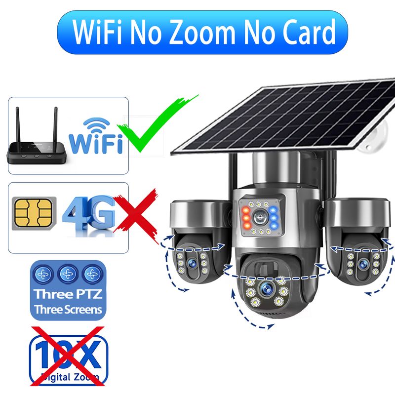 20MP 4G Sim Solar Camera WiFi 10X Optical Zoom 3-PTZ 4-Lens 3-Screens Outdoor Wireless Security Cameras Auto Tracking CCTV V380