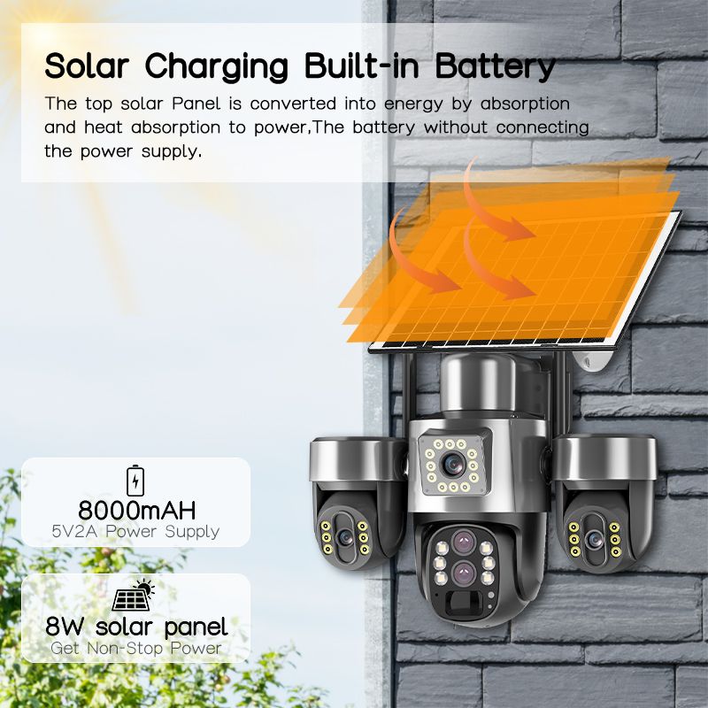 *. The left and right PTZ cameras support 180 ° pan rotation (Electric) and 180 ° tilt adjustment (Electric)8W Solar Panel, Efficient Solar Charging