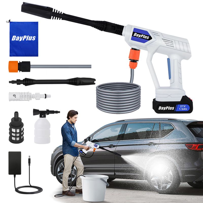 【Portable Pressure Washer】The cordless electric pressure washer features 0-180 adjustable nozzle. It can not only remove tough stains, but also offers lighter cleaning for watering plants or bathing pets, feel free to rotate the nozzle to suit your washing needs. It also comes with a 0 specific nozzle to suit your washing needs and a 300ml foam canister with nozzle for fast foaming andbetter cleaning.