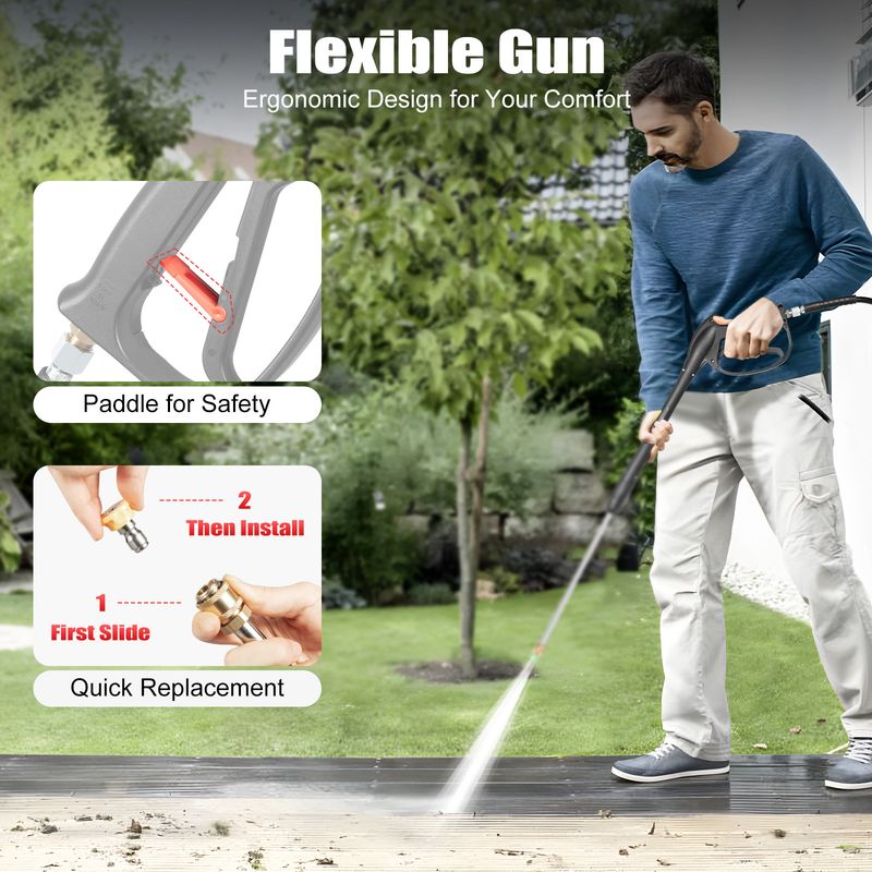 Flexible Gun: The ergonomically curved spray gun handle has a small paddle that can hold the pick to prevent sudden activation of the spray gun. In addition, if you want to replace the nozzle, simply slide the buckle at the top of the spray gun backward to achieve quick replacement.