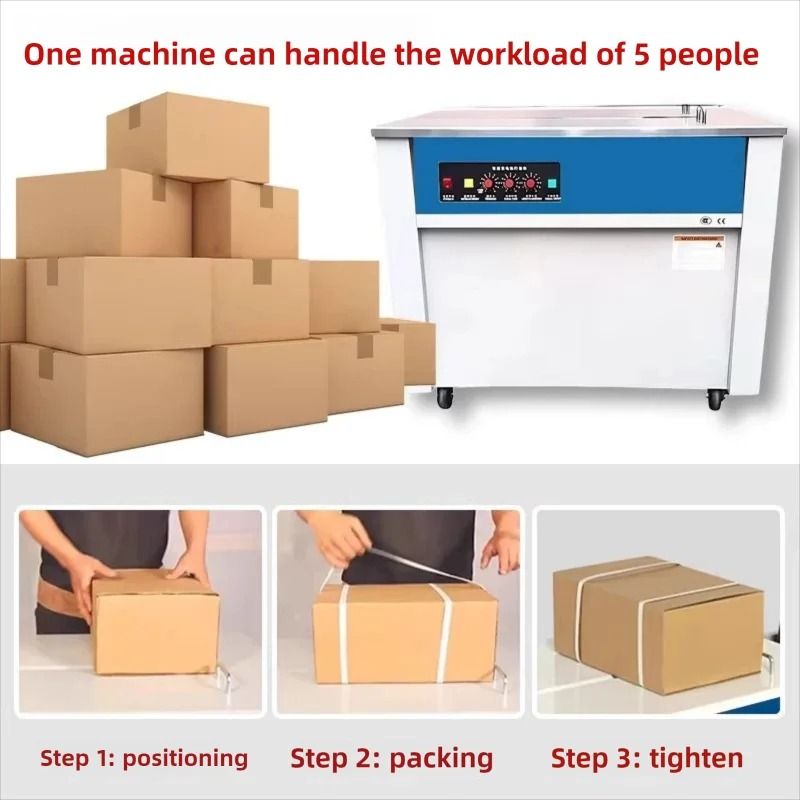 The 220V fully automatic strapping machine is an industrial-grade packaging equipment integrating sealing, strapping, and tightening functions, designed specifically for modern warehousing, logistics, and e-commerce companies. It adopts one-button efficient operation, achieving a fully automatic cycle from tape feeding, tightening, heat sealing, and cutting, significantly improving packaging efficiency and standardization.