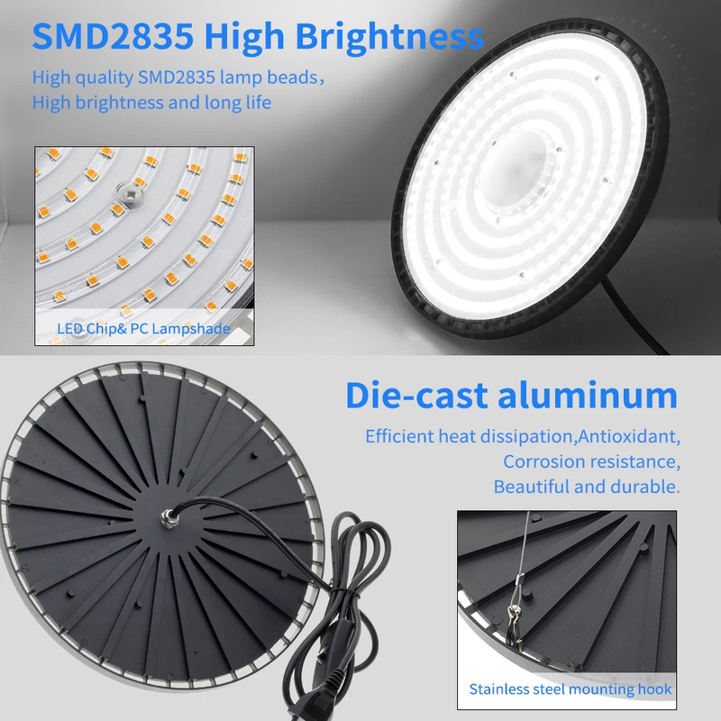 Wide Application-IP65 waterproof rated for wet locations. The UFO high bay light fixtures are perfect for warehouses, manufacturing plants, garages, gymnasiums, workshops, supermarkets, storage yards and other industrial and commercial spaces.