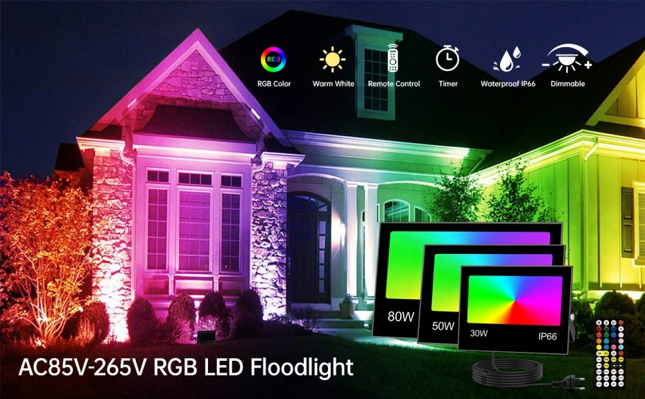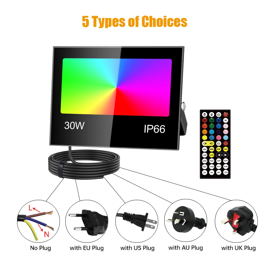 220V/110V RGB LED Flood Light 30W 50W 80W IP66 Waterproof Outdoor Projector Spotlight with Remote Dimmable & EU US AU UK Plug