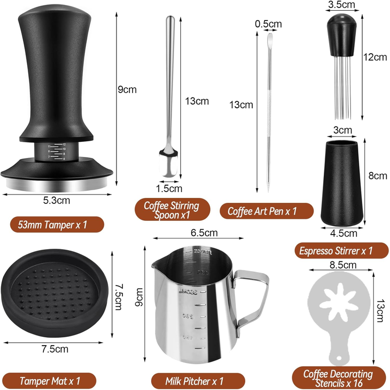 [Complete 22-Piece Barista Set] This professional espresso accessories set includes a 51mm coffee tamper, WDT tool, coffee tamper pad, 350ml milk frothing jug, 16 decorative templates, a latte art pen, and a coffee stirring spoon. Perfect for making beautiful coffee art and elevating your coffee experience.