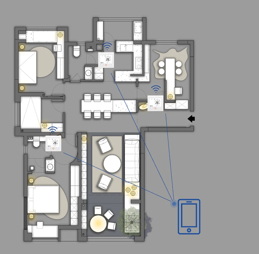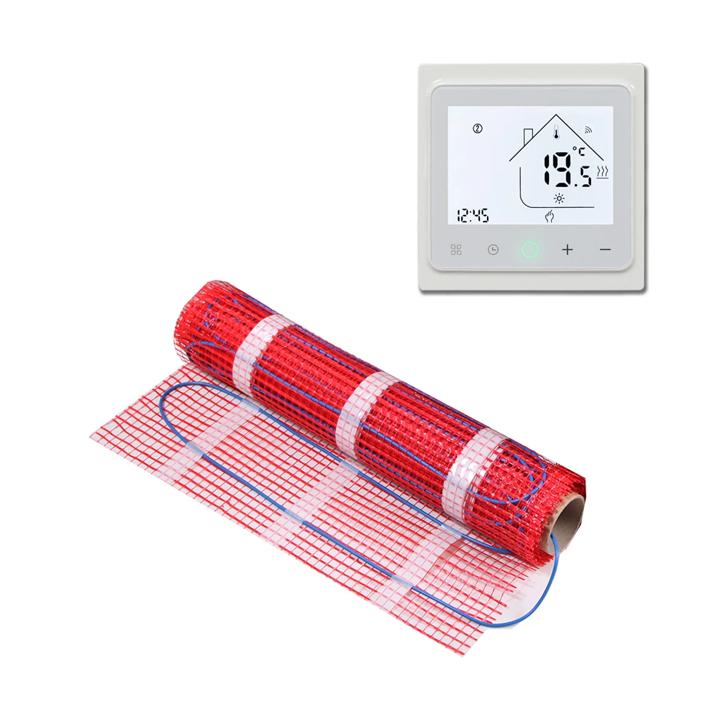 Please Note the color of mat maybe any color(red,white or blue),the thermostat is white.Mat size:Width:0.5m,Length:1 To 8m,For Example 1m2 Is 0.5m*2m,4m2 Is 0.5m*8m.The thermsotat is with wifi Tuya app and sensor,white.