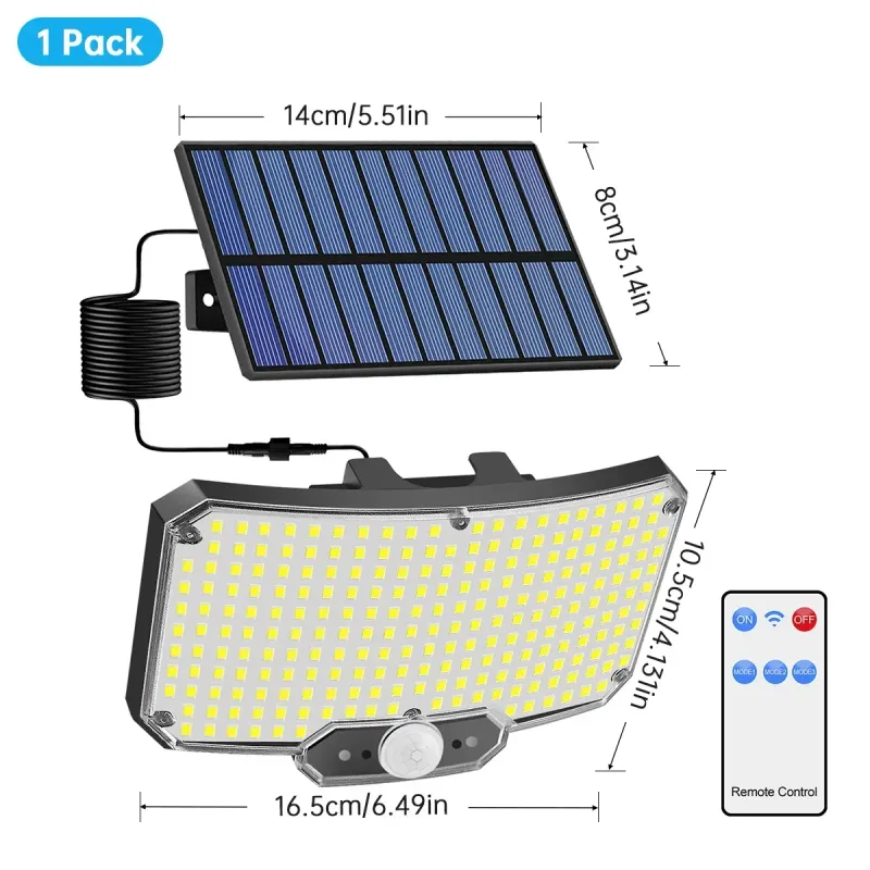 --These outdoor solar lights have a 180° motion sensor that can detect human or animal movement up to 23 feet away. The dusk to dawn feature includes 234 LEDs covered with convex optical lenses, providing a brighter and more concentrated light distribution compared to lights without lenses. The solar outdoor lights can be controlled with a remote from up to 10 feet away, making it easy to turn them off when necessary.