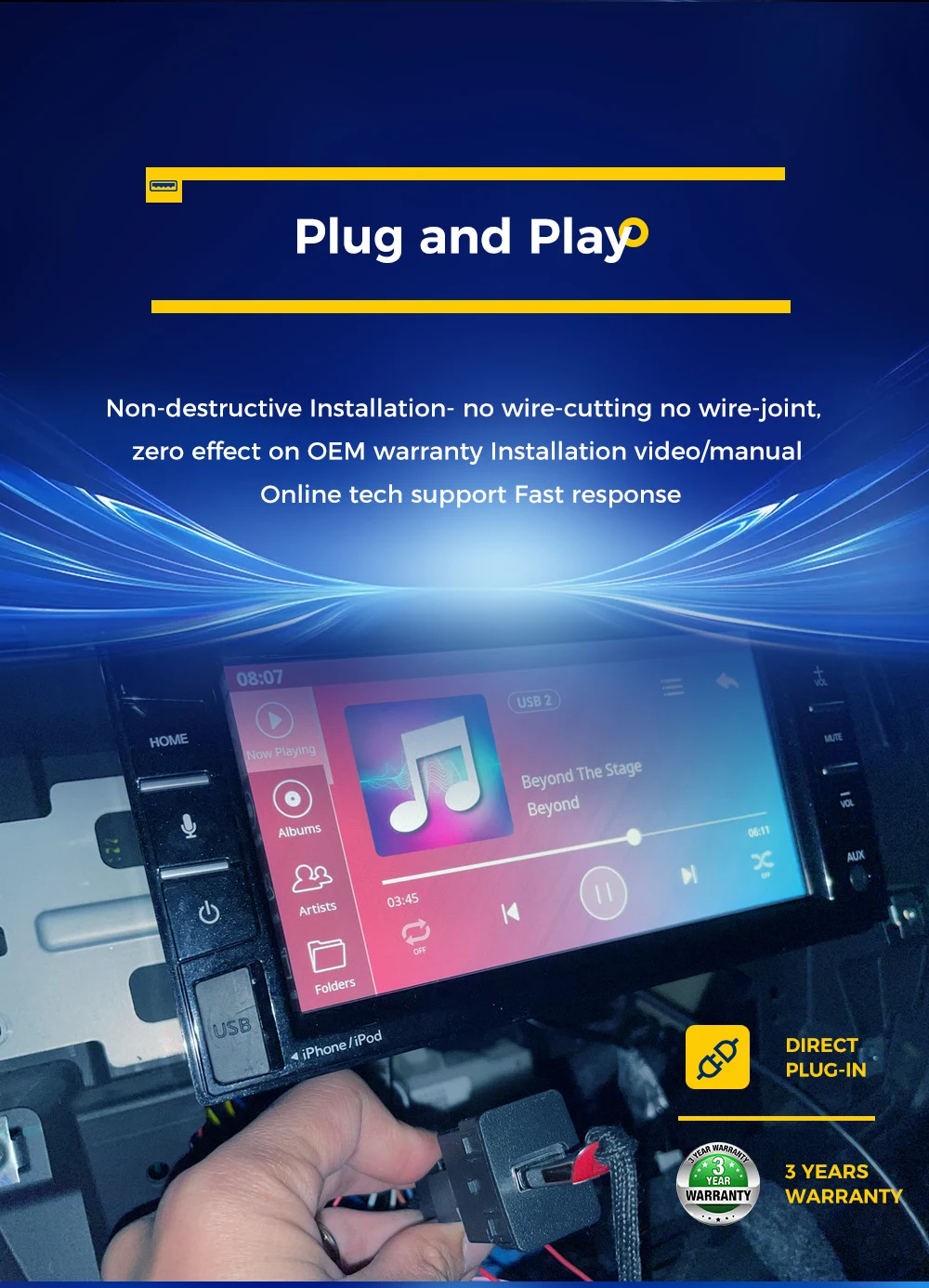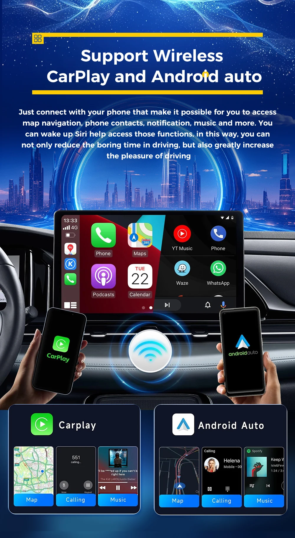 Apple carplay is the smarter and safer in-vehicle interface to operate your phone , just connect with your phone that make it possible for you to access map navigation, phone contacts, notification, music and more. You can wake up Siri help access those functions, in this way, you can not only reduce the boring time in driving, but also greatly increase the pleasure of driving