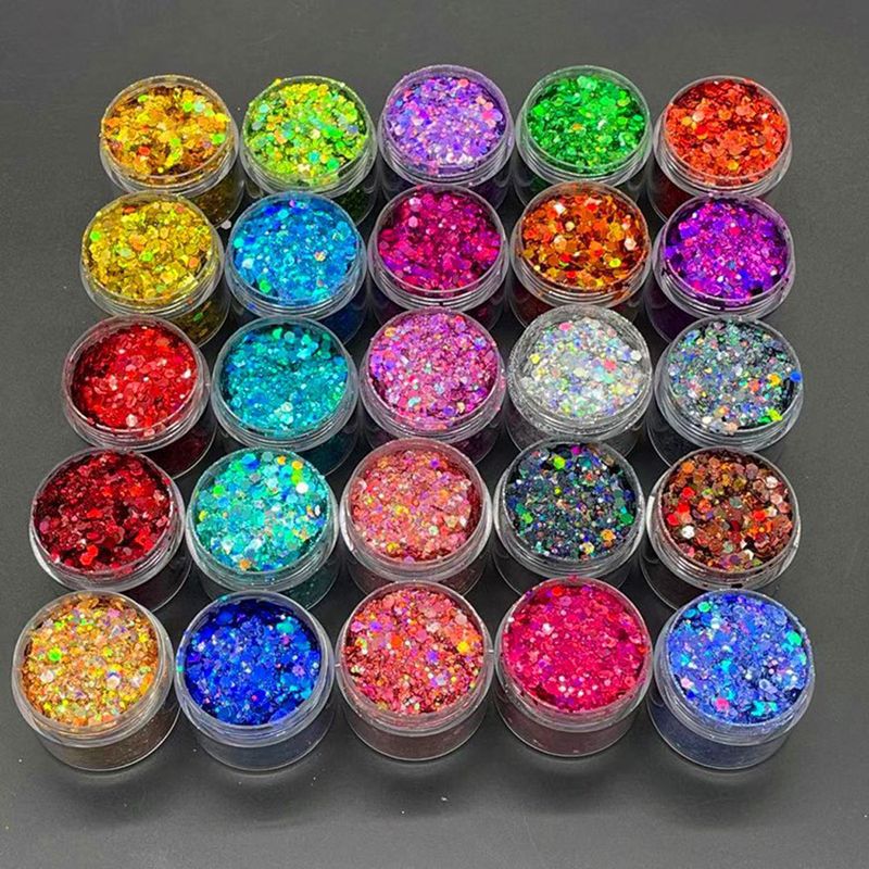 ✅ Ultra sparkling glitter comes in 24 amazing colors: Holographic Silver, Holographic Gold, Holographic Purple, Holographic Tiffany, Holographic Black, Holographic Dark Baby Pink, Holographic Blue, Holographic Red, Holographic Green, mixed Rose Gold and shampain, Iridescent Pink, Iridescent white. 11 boxes sizes are 1mm small & 2mm medium & 3mm large mixed which perfect for body& Face& Hair make up. One boxes size are 1mm small,perfect for nail arts decoration.
